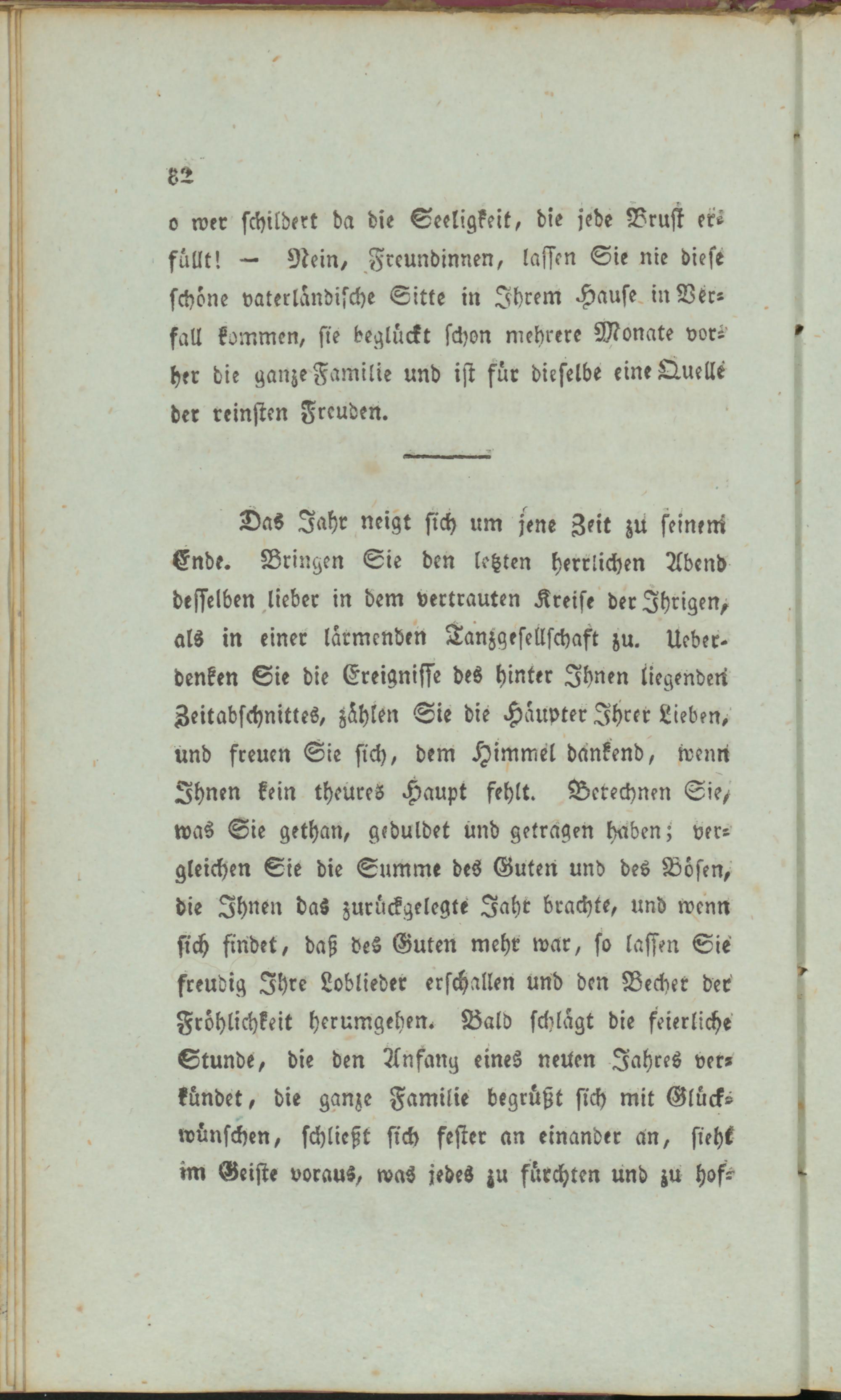 DaS Jahr neigt sich um jene Zeit zu seinem Ende. Bringen Sie den letzten herrlichen Abend desselben lieber in dem vertrauten Kreise der Ihrigen, als in einer lärmenden Tanzgesellschaft zu. Ueber- denken Sie die Ereignisse des hinter Ihnen liegenden Zeitabschnittes, zählen Sie die Häupter Ihrer Lieben, und freuen Sie sich, dem Himmel dankend, wenn Ihnen kein theures Haupt fehlt. Berechnen Sie> was Sie gethan, geduldet und getragen haben; vergleichen Sie die Summe des Guten und des Bösen, die Ihnen das zurückgelegte Jahr brachte, und wenn sich findet, daß des Guten mehr war, so lassen Sie freudig Ihre Loblieder erschallen und den Becher der Fröhlichkeit herumgehen, Bald schlagt die feierliche Stunde, die den Anfang eines neuen Jahres verkündet, die ganze Familie begrüßt sich mit Glückwünschen, schließt sich fester an einander an, sieht im Geiste voraus, was jedes zu fürchten und zu Hof-