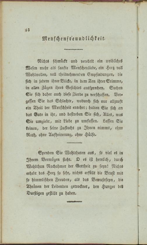 Nichts schmückt und veredelt ein weibliches Wesen mehr als sanfte Menschenliebe, ein Herz voll Wohlwollen, voll teilnehmenden Empfindungen, die sich in jedem ihrer Blicke, in dem Ton ihrer Stimme, in allen Zügen ihres Gesichtes aussprechen. Suchen Sie sich daher auch diese Zierde zu verschaffen. Vergessen Sie das Schlechte, wodurch sich nur allzuoft ein Theil der Menschheit entehrt; halten Sie sich an das Gute in ihr, und bestreben Sie sich, Alles, was Sie umgiebt, mit Liebe zu umfassen. Lassen Sie keinen, der seine Zuflucht zu Ihnen nimmt, ohne Rath, ohne Aufheiterung, ohne Hülfe.