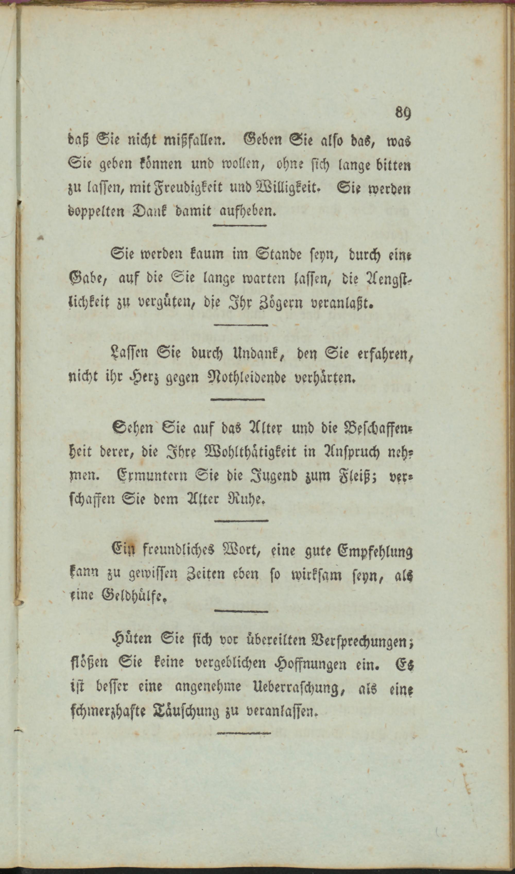 Sehen Sie auf das Alter und die Beschaffen» heit derer, die Ihre Wohlthätigkeit in Anspruch nehmen. Ermuntern Sie die Jugend zum Fleiß; verschaffen Sie dem Alter Ruhe.