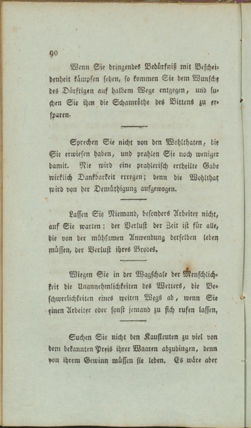 Wenn Sie dringendes Bedürfniß mit Bescheidenheit kämpfen sehen, so kommen Sie dem Wunsch? des Dürftigen auf halbem Wege entgegen, und suchen Sie ihm die Schamröthe des Bittens zu ersparen.