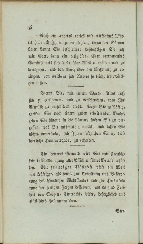Ein heiteres Gemüth wird Sie mit Freudigkeit in Vollbringung aller Pflichten Ihres Berufs erfüllen. Mit freudiger Thätigkeit wirkt ein Weib viel kräftiger, als sonst, zur Erhaltung und Beförderung des häuslichen Wohlstandes und zür Herbeiführung der sceligen Folgen desselben, als da sind Freiheit von Sorgen, Eintracht, Liebe, behagliches und glückliches Zusammenleben.