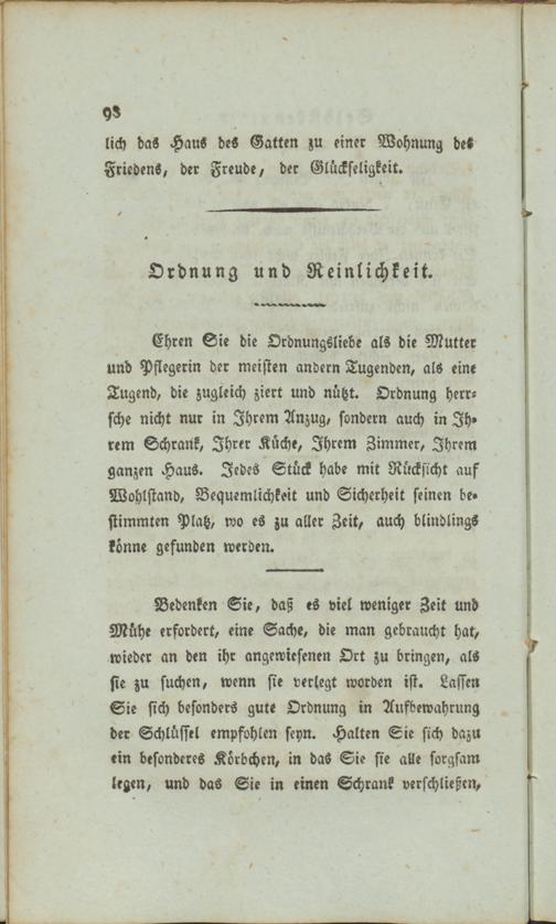 Ehren Sie die Ordnungsliebe als die Mutter und Pflegerin der meisten andern Tugenden, als eine Tugend, die zugleich ziert und nützt. Ordnung herrsche nicht nur in Ihrem Anzug, sondern auch in Ihrem Schrank, Ihrer Küche, Ihrem Zimmer, Ihrem ganzen Haus. Jedes Stück habe mit Rücksicht auf Wohlstand, Bequemlichkeit und Sicherheit seinen bestimmten Platz, wo es zu aller Zeit, auch blindlings könne gefunden werden.