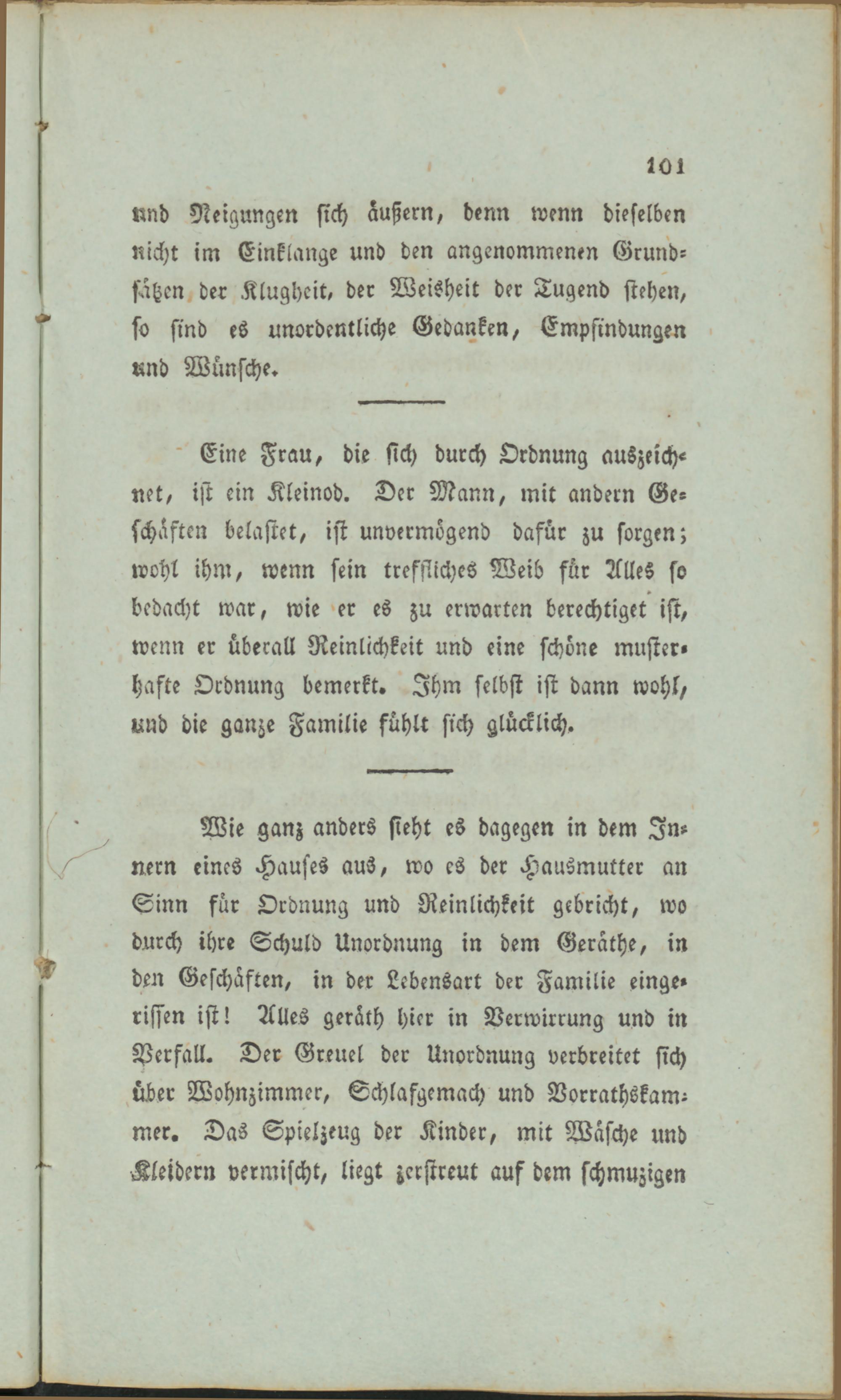 ' Eine Frau, die sich durch Ordnung auszeichnet, ist ein Kleinod. Der Mann, mit andern Geschäften belastet, ist unvermögend dafür zu sorgen; wohl ihm, wenn sein treffliches Weib für Alles so bedacht war, wie er es zu erwarten berechtiget ist, wenn er überall Reinlichkeit und eine schöne musterhafte Ordnung bemerkt. Ihm selbst ist dann wohl, und die ganze Familie fühlt sich glücklich.