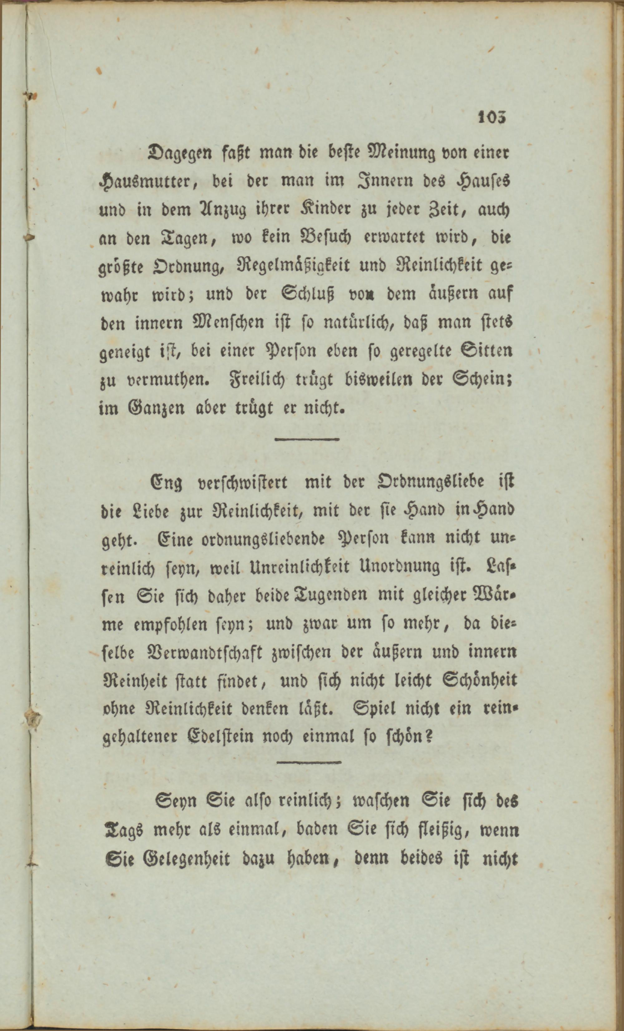Eng verschwistert mit der Ordnungsliebe ist die Liebe zur Reinlichkeit, mit der ste Hand in Hand geht. Eine ordnungsliebende Person kann nicht unreinlich seyn, weil Unreinlichkeit Unordnung ist. Lassen Sie sich daher beide Tugenden mit gleicher Wärme empfohlen seyn; und zwar um so mehr, da dieselbe Verwandtschaft zwischen der äußern und innern Reinheit statt findet, und sich nicht leicht Schönheit ohne Reinlichkeit denken laßt. Spiel nicht ein reingehaltener Edelstein noch einmal so schön?