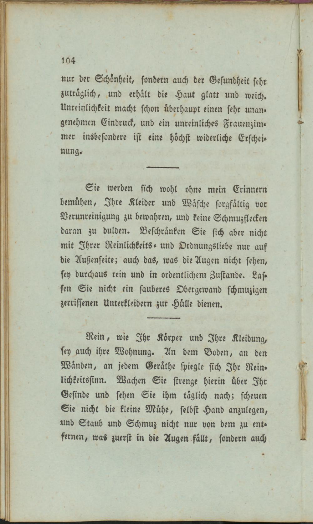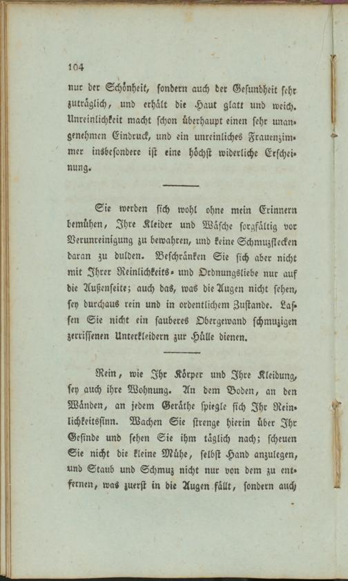 Rein, wie Ihr Körper und Ihre Kleidung, sey auch ihre Wohnung. An dem Boden, an den Wänden, an jedem Geräthe spiegle sich Ihr Rein» lichkeitssinn. Wachen Sie strenge hierin über Ihr Gesinde und sehen Sie ihm täglich nach; scheuen Sie nicht die kleine Mühe, selbst Hand anzulegen, und Staub und Schmuz nicht nur von dem zu ent» fernen, was zuerst in die Augen fällt, sondern auch