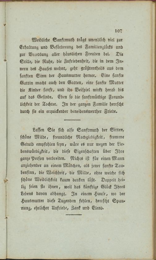 Lassen Sie sich also Sanftmuth der Sitten, schöne Milde, freundliche Nachgiebigkeit, fromme Geduld empfohlen seyn, wäre es nur wegen der Liebenswürdigkeit, die diese Eigenschaften über Ihre ganze Person verbreiten. Nichts ist für einen Mann anziehender an einem Mädchen, als jener sanfte Tau» bensinn, die Weichheit, die Milde, ohne welche sich schöne Weiblichkeit kaum denken läßt. Doppelt heilig seien sie ihnen, weil das künftige Glück Ihres Lebens davon abhängt. In einem Hause, wo der Hausmutter diese Tugenden fehlen, herrscht Spannung, ehelicher Unfriede, Zank und Elend.