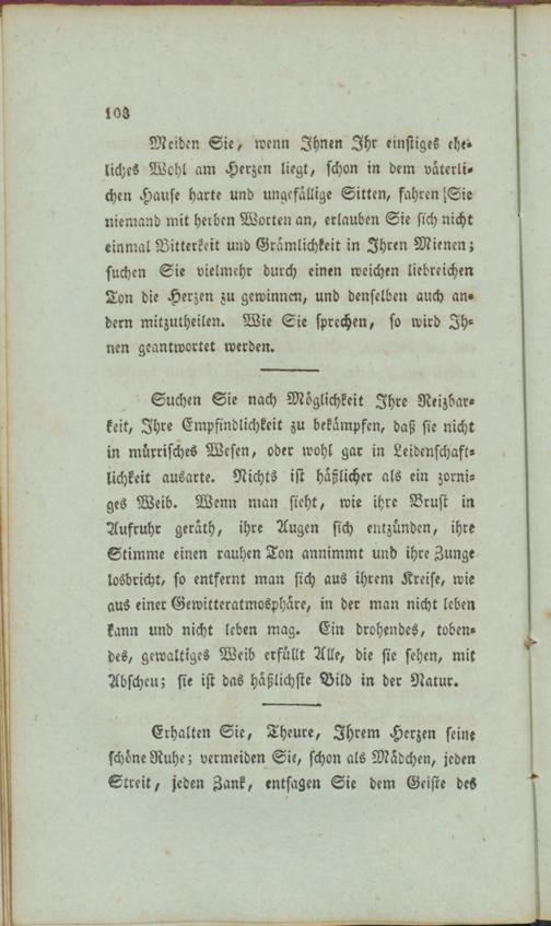 Suchen Sie nach Möglichkeit Ihre Reizbarkeit, Ihre Empfindlichkeit zu bekämpfen, daß sie nicht in mürrisches Wesen, oder wohl gar in Leidenschaftlichkeit ausarte. Nichts ist häßlicher als ein zorniges Weib. Wenn man sieht, wie ihre Brust in Aufruhr gerath, ihre Augen sich entzünden, ihre Stimme einen rauhen Ton annimmt und ihre Zunge losbricht, so entfernt man sich aus ihrem Kreise, wie aus einer Gewitteratmosphäre, in der man nicht leben kann und nicht leben mag. Ein drohendes, tobendes, gewaltiges Weib erfüllt Alle, die sie sehen, mit Abscheu; sie ist das häßlichste Bild in der Natur.