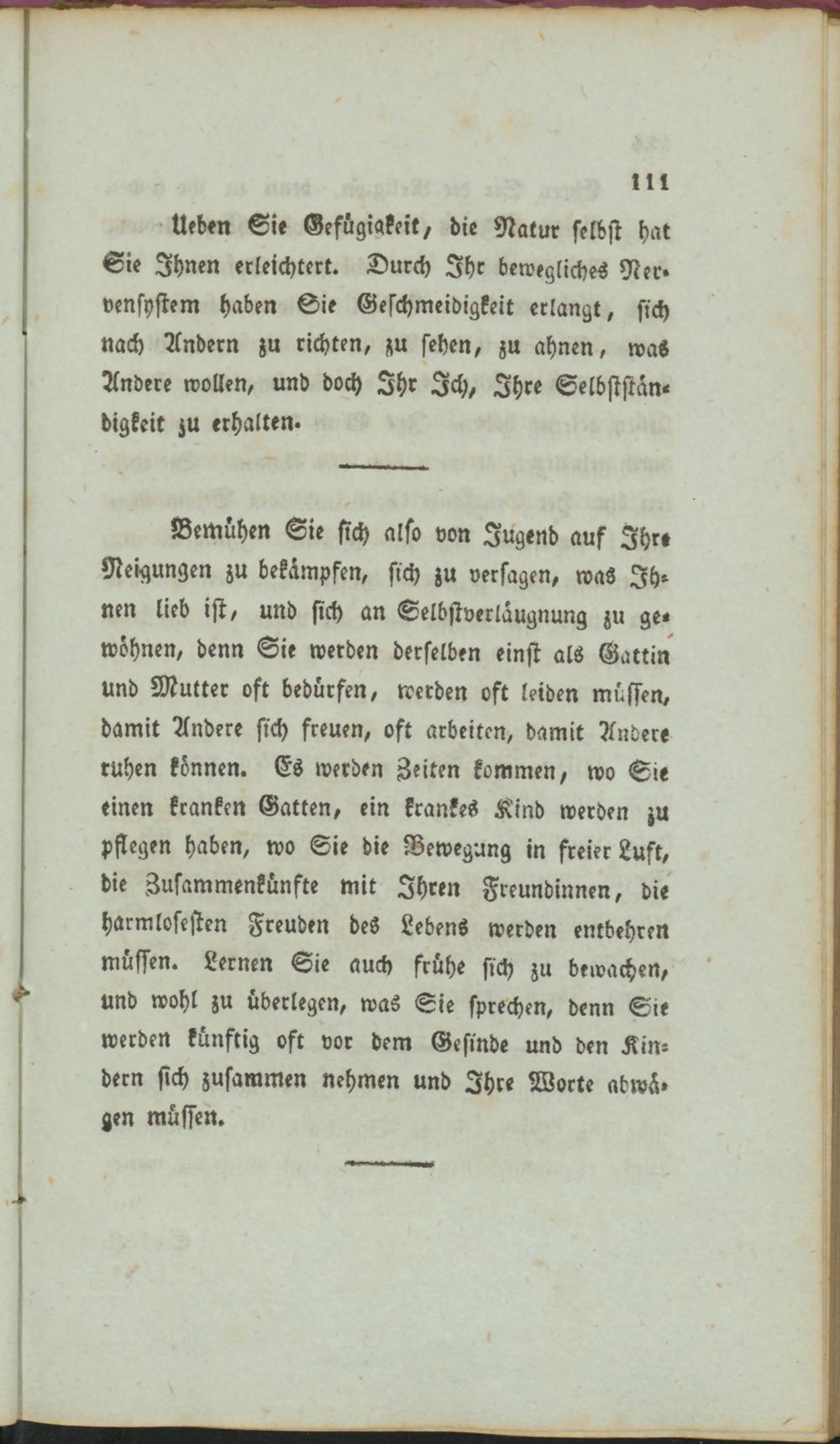 Bemühen Sie sich also von Jugend auf Ihr» Neigungen zu bekämpfen, sich zu versagen, was Ihnen lieb ist, und sich an Selbstverlaugnung zu ge« wohnen, denn Sie werden derselben einst als Gattin Und Mutter oft bedürfen, werden oft leiden müssen, damit Andere sich freuen, oft arbeiten, damit Andere ruhen können. Es werden Zeiten kommen, wo Sie einen kranken Gatten, ein krankes Kind werden zu pflegen haben, wo Sie die Bewegung in freier Luft, die Zusammenkünfte mit Ihren Freundinnen, die harmlosesten Freuden des Lebens werden entbehren müssen. Lernen Sie auch frühe sich zu bewachen, und wohl zu überlegen, was Sie sprechen, denn Sie werden künftig oft vor dem Gesinde und den Kindern sich zusammen nehmen und Ihre Worte abwä« gen müssen.