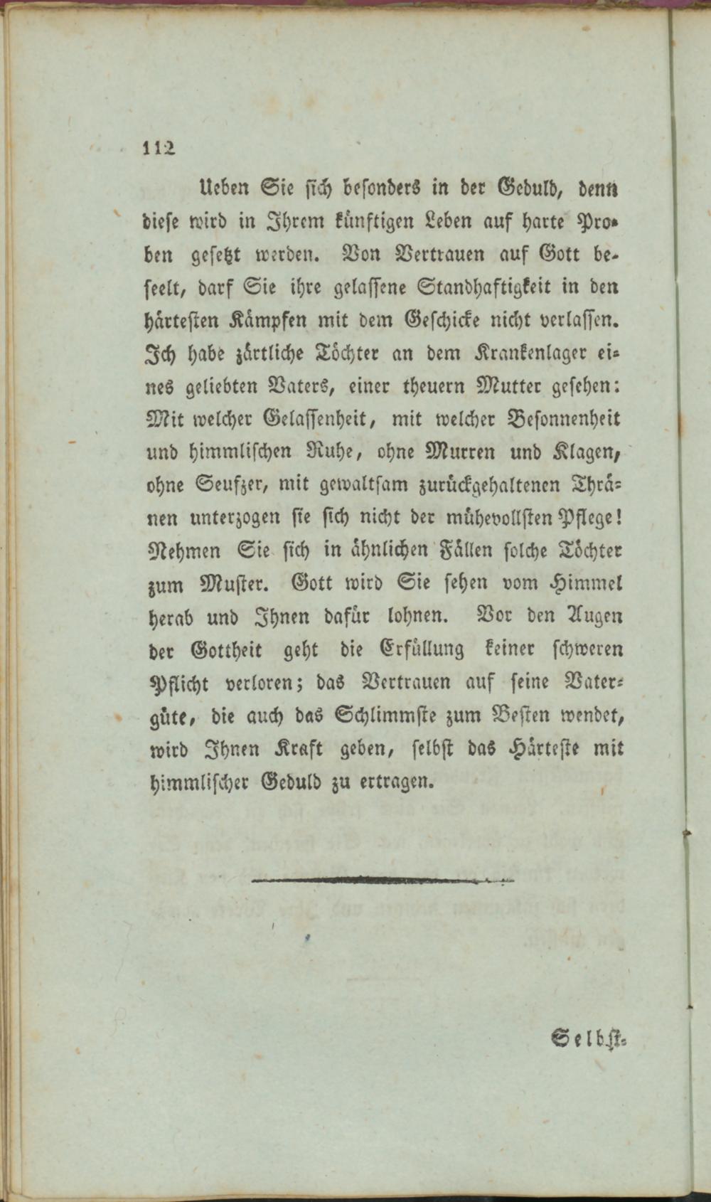 Uebm Sie sich besonders in der Geduld, denn diese wird in Ihrem künftigen Leben auf harte Pro» ben gesetzt werden. Von Vertrauen auf Gott be« seelt, darf Sie ihre gelassene Standhaftigkeil in den härtesten Kämpfen mit dem Geschicke nicht verlassen. Ich habe zärtliche Töchter an dem Krankenlager eines geliebten Vaters, einer theuern Mutter gesehen: Mit welcher Gelassenheit, mit welcher Besonnenheit und himmlischen Ruhe, ohne Murren und Klagen, ohne Seufzer, mit gewaltsam zurückgehaltenen Thränen unterzogen sie sich nicht der mühevollsten Pflege! Nehmen Sie sich in ähnlichen Fällen solche Töchter zum Muster. Gott wird Sie sehen vom Himmel herab und Ihnen dafür lohnen. Vor den Augen der Gottheit geht die Erfüllung keiner schweren Pflicht verloren; das Vertrauen auf seine Vatergüte, die auch das Schlimmste zum Besten wendet, wird Ihnen Kraft geben, selbst das Härteste mit himmlischer Geduld zu ertragen. ,