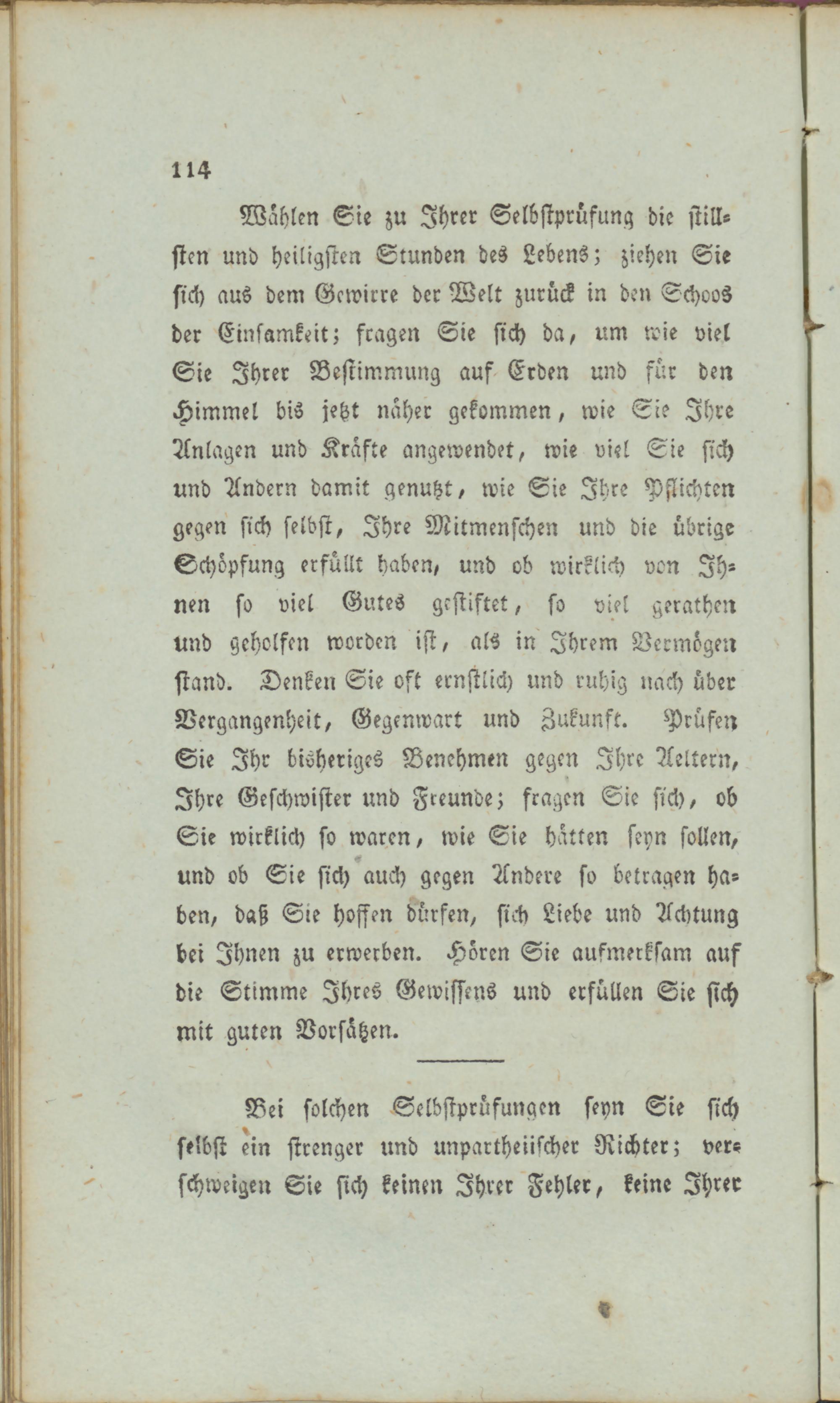 Wahlen Sie zu Ihrer Selbstprüfung die stillsten und heiligsten Stunden des Lebens; ziehen Sie sich aus dem Gewirrs der Welt zurück in den Schoos der Einsamkeit; fragen Sie sich da, um wie viel Sie Ihrer Bestimmung auf Erden und für den Himmel bis jetzt naher gekommen, wie Sie Ihre Anlagen und Kräfte angewendet, wie viel Sie sich und Andern damit genutzt, wie Sie Ihre Pflichten gegen sich selbst, Ihre Mitmenschen und die übrige Schöpfung erfüllt haben, und ob wirklich von Ihnen so viel Gutes gestiftet, so viel gerathen und geholfen worden ist, als in Ihrem Vermögen stand. Denken Sie oft ernstlich und ruhig nach über Vergangenheit, Gegenwart und Zukunft. Prüfen Sie Ihr bisheriges Benehmen gegen Ihre Aeltern, Ihre Geschwister und Freunde; fragen Sie sich, ob Sie wirklich so waren, wie Sie hatten seyn sollen, und ob Sie sich auch gegen Andere so betragen haben, daß Sie hoffen dürfen, sich Liebe und Achtung bei Ihnen zu erwerben. Hören Sie aufmerksam auf die Stimme Ihres Gewissens und erfüllen Sie sich mit guten Vorsätzen.