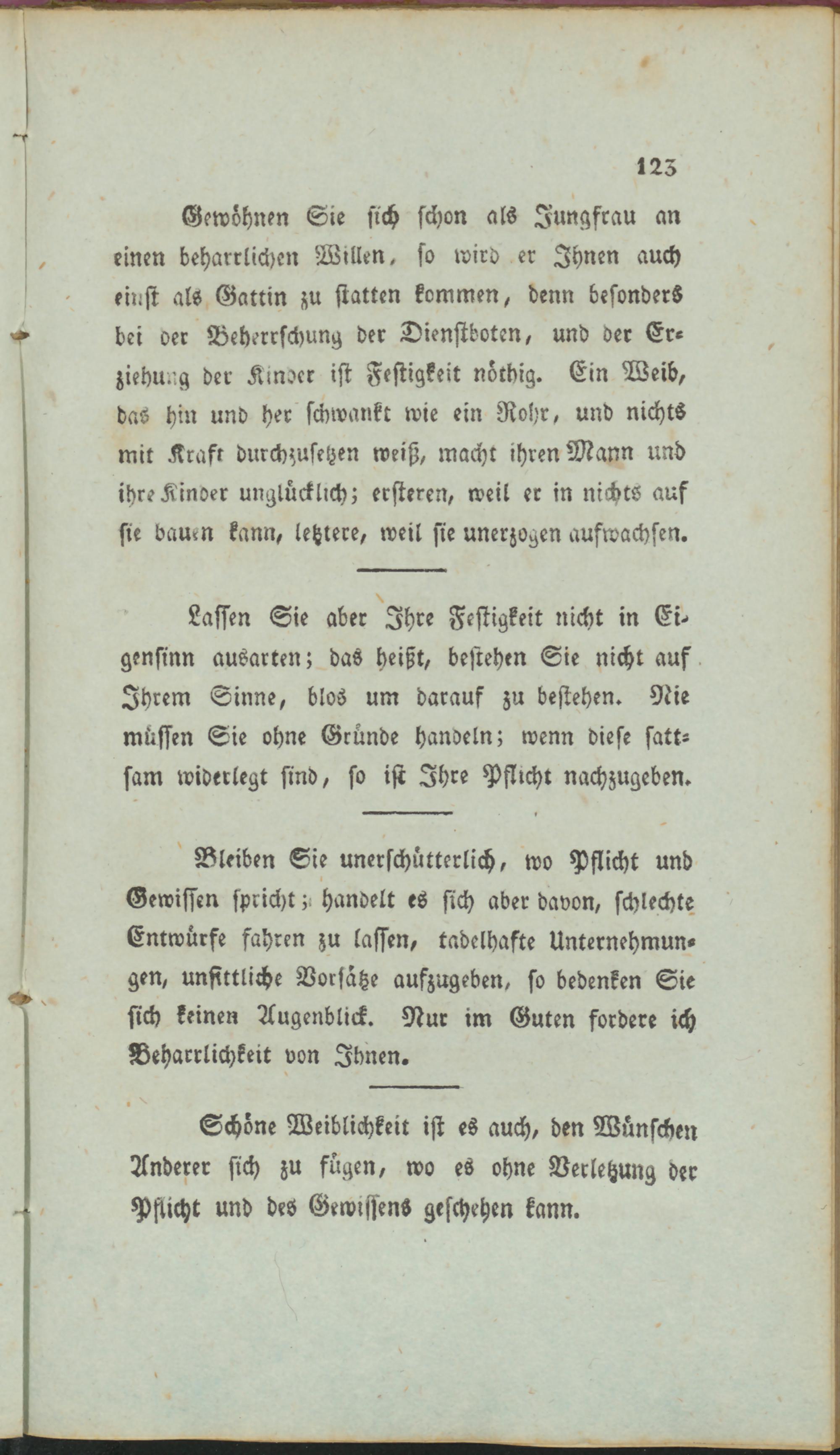 Gewöhnen Sie sich schon als Jungfrau an einen beharrlichen Willen, so wird er Ihnen auch einst als Gattin zu statten kommen, denn besonders bei oer Beherrschung der Dienstboten, und der Erziehung der Kinder ist Festigkeit nöthig. Ein Weib, das hin und her schwankt wie ein Rohr, und nichts mit Kraft durchzusetzen weiß, macht ihren Mann und ihre Kinder unglücklich; ersteren, weil er in nichts auf sie damn kann, letztere, weil sie unerzogen aufwachsen.