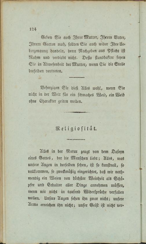 Geben Sie auch Ihrer Mutter, Ihrem Vater, Ihrem Gatten nach, sollten Sie auch wider Ihre Ueberzeugung handeln, denn Nachgeben aus Pflicht ist Ruhm und verdirbt nicht- Desto standhafter seyen Sie in Abwesenheit der Mutter, wenn Sie die Stelle derselben vertreten.