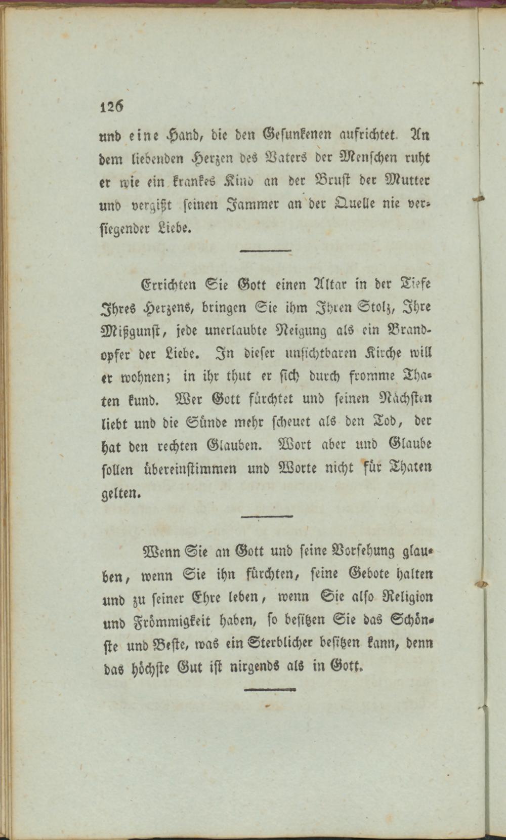 Errichten Sie Gott einen Altar in der Tiefe Ihres Herzens, bringen Sie ihm Ihren Stolz, Ihre Mißgunst, jede unerlaubte Neigung als ein Brandopfer der Liebe. In dieser unsichtbaren Kirche will er wohnen; in ihr thut er sich durch fromme Thaten kund. Wer Gott fürchtet und seinen Nächsten liebt und die Sünde mehr scheuet als den Tod, der hat den rechten Glauben. Wort aber und Glaube sollen übereinstimmen und Worte nicht für Thaten gelten.