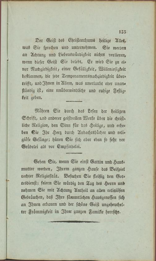 Geben Sie, wenn Sie einst Gattin und Hausmutter werden, Ihrem ganzen Hause das Beispiel rechter Religiosität. Besuchen Sie fleißig den Gottesdienst; feiern Sie würdig den Tag des Herrn und nehmen Sie mit Achtung Antheil an allen religiösen Gebräuchen, daß Ihre sämmtlichen Hausgenossen sich an Ihnen erbauen und der schöne Geist ungeheuchel- ter Frömmigkeit in Ihrer ganzen Familie herrsche.