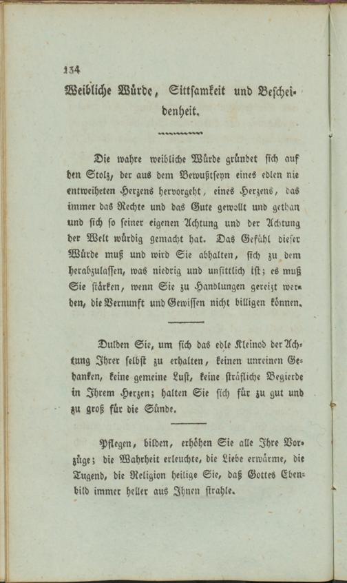 Die wahre weibliche Würde gründet sich auf den Stolz, der aus dem Bewußtseyn eines edlen nie «ntweiheten Herzens hervorgeht, eines Herzens, das immer das Rechte und das Gute gewollt und gethan und sich so seiner eigenen Achtung und der Achtung der Welt würdig gemacht hat. Das Gefühl dieser Würde muß und wird Sie abhalten, sich zu dem herabzulassen, was niedrig und unsittlich ist; es muß Sie stärken, wenn Sie zu Handlungen gereizt wer» den, die Vernunft und Gewissen nicht billigen können.