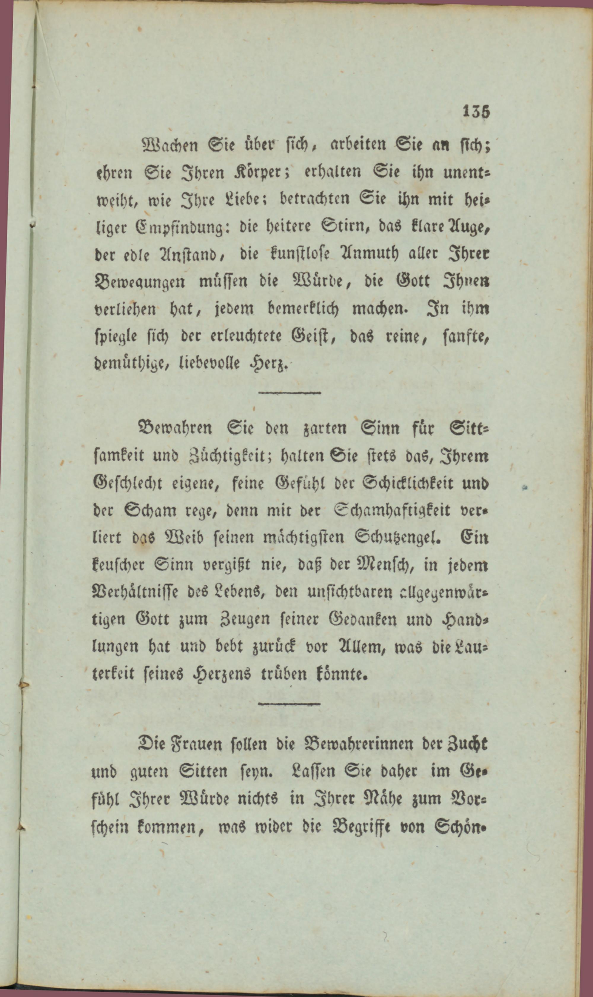 Die Frauen sollen die Bewahrerinnen der Zucht und guten Sitten seyn. Lassen Sie daher im Ge» fühl Ihrer Würde nichts in Ihrer Nahe zum Vorschein kommen, was wider die Begrifft von Schön»