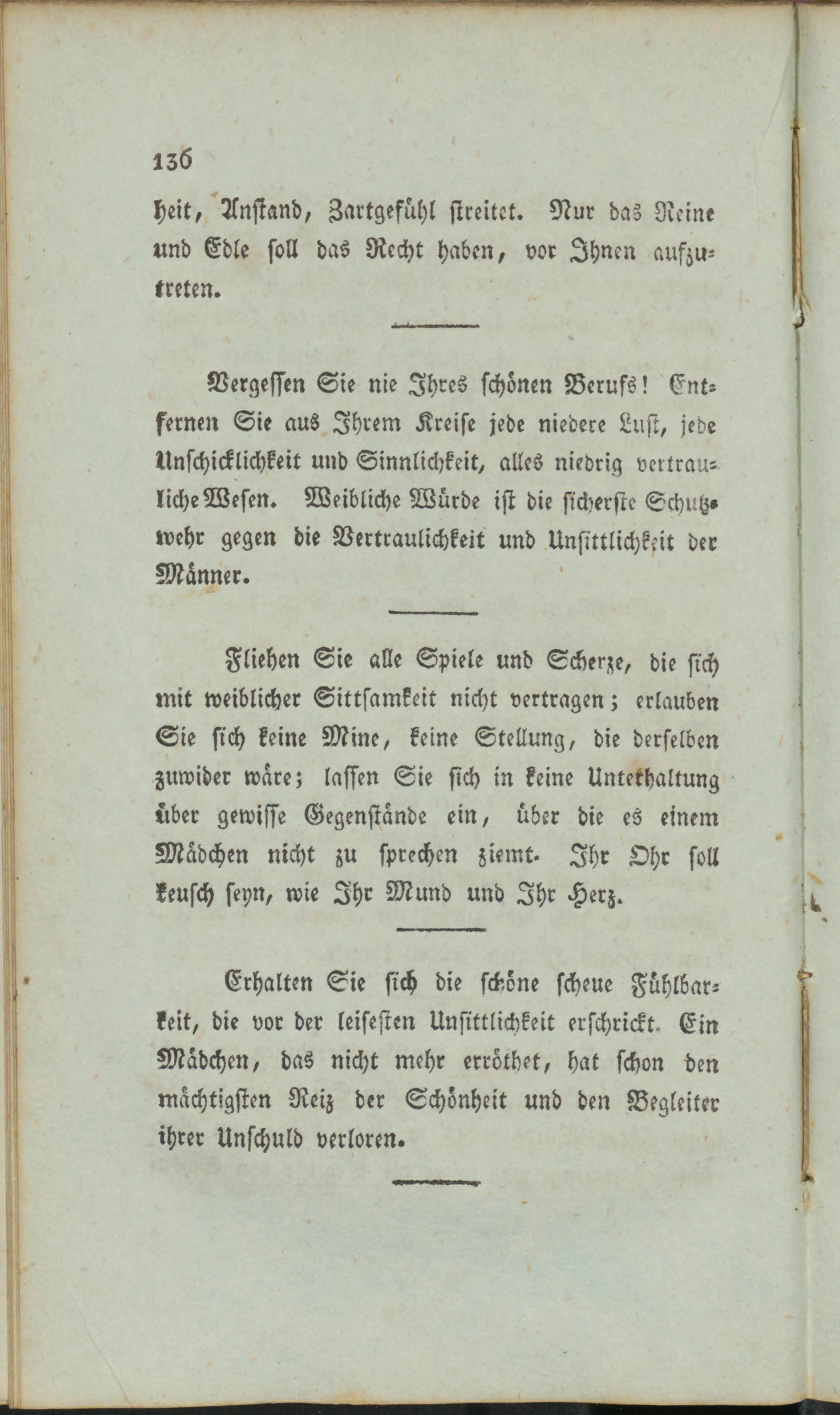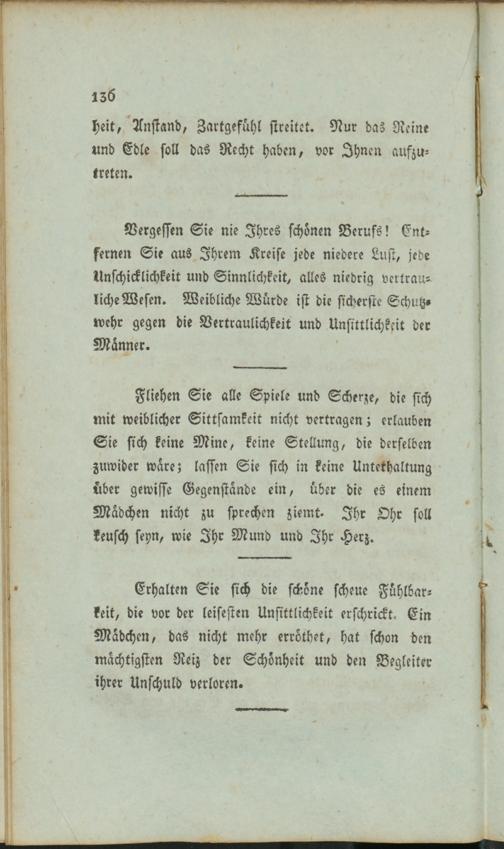 Fliehen Sie alle Spiele und Scherze, die sich mit weiblicher Sittsamkeit nicht vertragen; erlauben Sie sich keine Mine, keine Stellung, die derselben zuwider wäre; lassen Sie sich in keine Unterhaltung über gewisse Gegenstände ein, über die es einem Mädchen nicht zu sprechen ziemt. Ihr Ohr soll keusch seyn, wie Ihr Mund und Ihr Herz.
