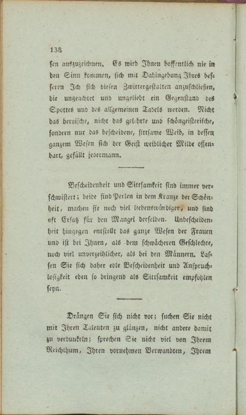 sen auszuzeichnen. Es wird Ihnen hoffentlich nie in den Sinn kommen, sich mit Dahingebung Ihres besseren Ich sich diesen Zmiktergestalten anzuschließen, die ungeachtet und ungeliebt ein Gegenstand des Spottes und des allgemeinen Tadels weroen. Nicht das heroische, nicht das gelchrte und schöngeisterische, sondern nur das bescheidene, sittsame Weib, in dessen ganzem Wesen sich der Geist weiblicher Milde offenbart, gefallt jedermann.
