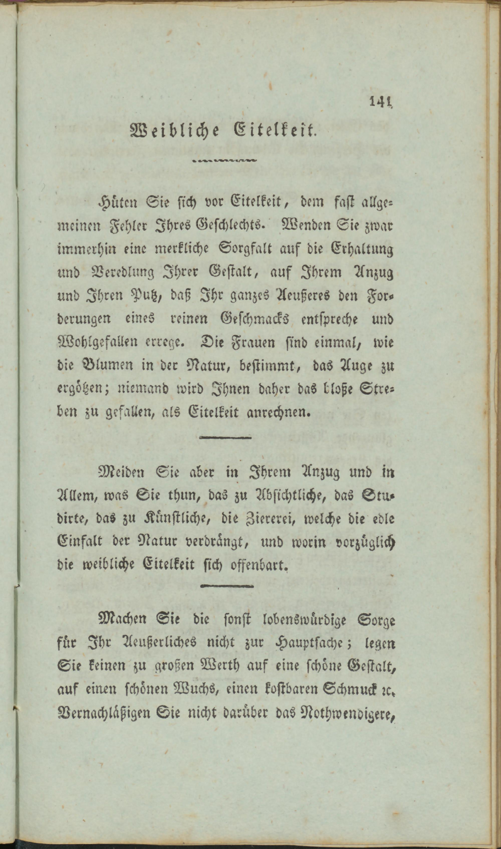 Hüten Sie sich vor Eitelkeit, dem fast allgemeinen Fehler Ihres Geschlechts. Wenden Sie zwar immerhin eine merkliche Sorgfalt auf die Erhaltung und Veredlung Ihrer Gestalt, auf Ihrem Anzug und Ihren Putz, daß Ihr ganzes Aeußeres den Forderungen eines reinen Geschmacks entspreche und Wohlgefallen errege. Die Frauen sind einmal, wie die Blumen in der Natur, bestimmt, das Auge zu ergötzen; niemand wird Ihnen daher das bloße Streben zu gefallen, als Eitelkeit anrechnen.
