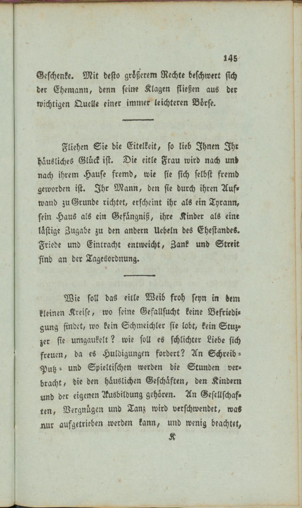Wie soll das eitle Weib froh seyn in dem kleinen Kreise, wo seine Gefallsucht keine Befriedigung findet, wo kein Schmeichler sie lobt, kein Stuz« zer sie umgaukelt? wie soll es schlichter Liebe sich freuen, da es Huldigungen fordert? An Schreib - Putz -- und Spieltischen werden die Stunden verbracht, die den häuslichen Geschäften, den Kindern und der eigenen Ausbildung gehören. An Gescllschaf» ten, Vergnügen und Tanz wird verschwendet, war nur aufgetrieben werden kann, und wenig beachtet,