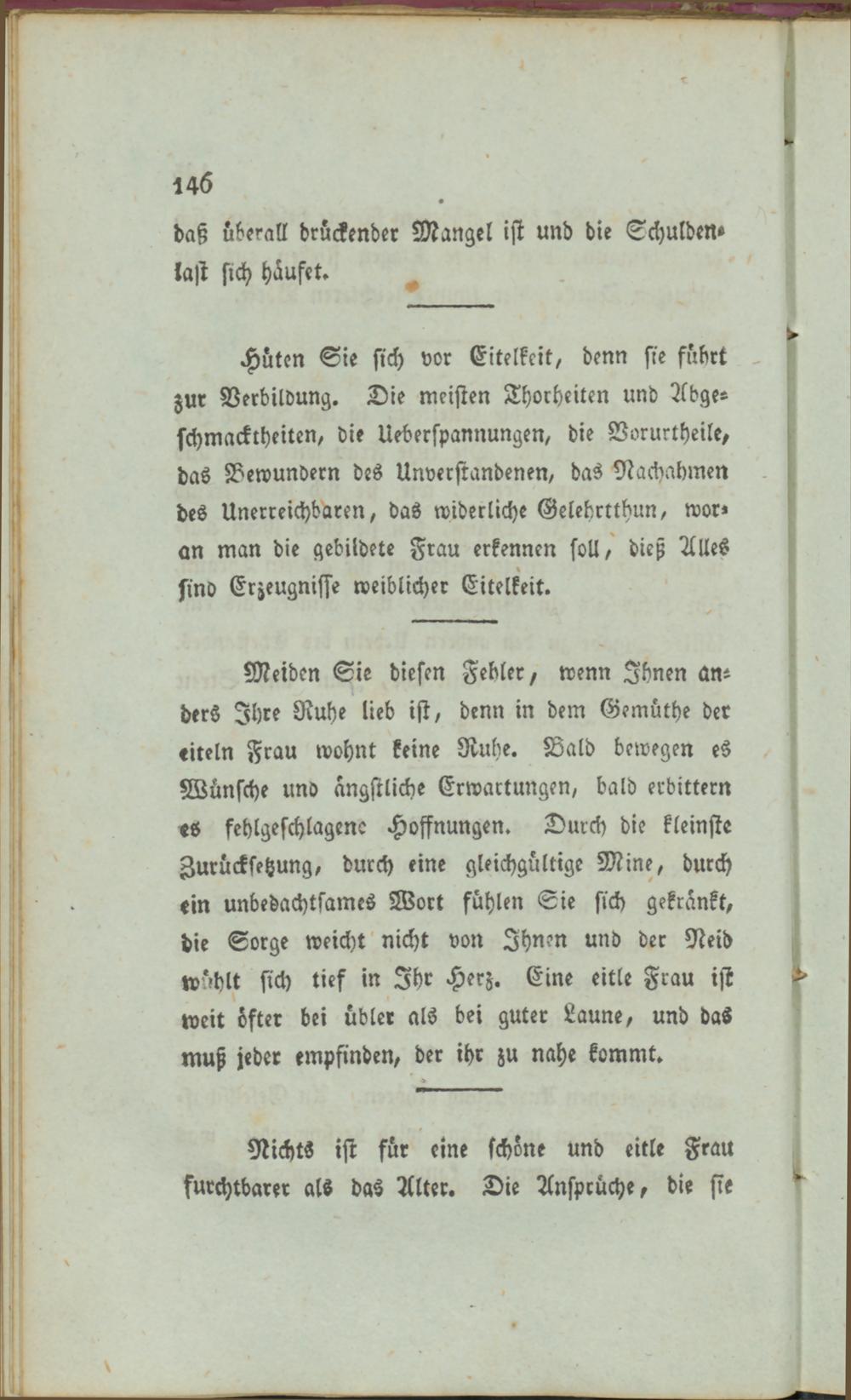 Meiden Sie diesen Fehler, wenn Ihnen anders Ihre Ruhe lieb ist, denn in dem Gemüthe der «iteln Frau wohnt keine Ruhe. Bald bewegen es Wünsche und ängstliche Erwartungen, bald erbittern es fehlgeschlagene Hoffnungen. Durch die kleinste Zurücksetzung, durch eine gleichgültige Mine, durch ein unbedachtsames Wort fühlen Sie sich gekrankt, die Sorge weicht nicht von Ihnen und der Neid wühlt sich tief in Ihr Herz. Eine eitle Frau ist weit öfter bei übler als bei guter Laune, und das muß jeder empfinden, der ihr zu nahe kommt.