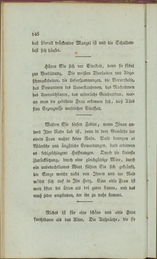 Hüten Sie sich vor Eitelkeit, denn sie führt - zur Verbildung. Die meisten Thorheiten und Abgeschmacktheiten, die Überspannungen, die Vorurtheile, das Bewundern des Unverstandenen, das Nachahmen des Unerreichbaren, das widerliche Gelehrtthun, wor» an man die gebildete Frau erkennen soll, dieß Alles sind Erzeugnisse weiblicher Eitelkeit.