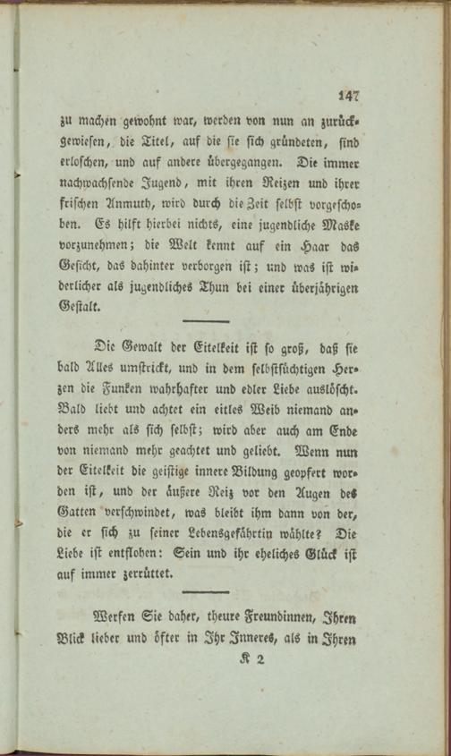 Die Gewalt der Eitelkeit ist so groß, daß sie bald Alles umstrickt, und in dem selbstsüchtigen Her» zen die Funken wahrhafter und edler Liebe auslöscht. Bald liebt und achtet ein eitles Weib niemand an» ders mehr als sich selbst; wird aber auch am Ende von niemand mehr geachtet und geliebt. Wenn nun der Eitelkeit die geistige innere Bildung geopfert wor» den ist, und der äußere Reiz vor den Augen de- Gatten verschwindet, was bleibt ihm dann von der, die er sich zu seiner Lebensgefährtin wählte? Die Liebe ist entflohen: Sein und ihr eheliches Glück ist auf immer zerrüttet.