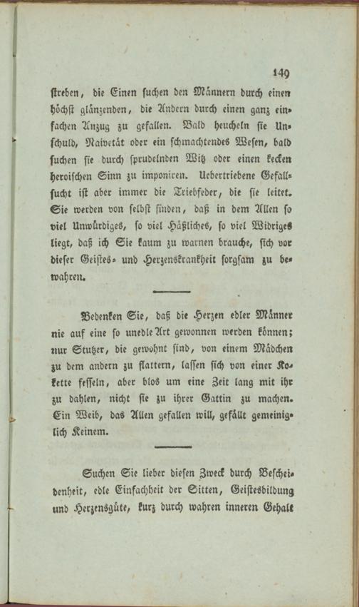 streben/ die Einen suchen den Männern durch einen höchst glänzenden/ die Andern durch einen ganz ein» fachen Anzug zu gefallen. Bald heucheln sie Un- schuld, Naivetät oder ein schmachtendes Wesen, bald suchen sie durch sprudelnden Witz oder einen kecken heroischen Sinn zu imponiern. Uebertriebene Gefallsucht ist aber immer die Triebfeder, die sie leitet. Sie werden von selbst finden, daß in dem Allen so viel Unwürdiges, so viel Häßliches, so viel Widriges liegt, daß ich Sie kaum zu warnen brauche, sich vor dieser Geistes- und Herzenskrankheit sorgsam zu bewahren.