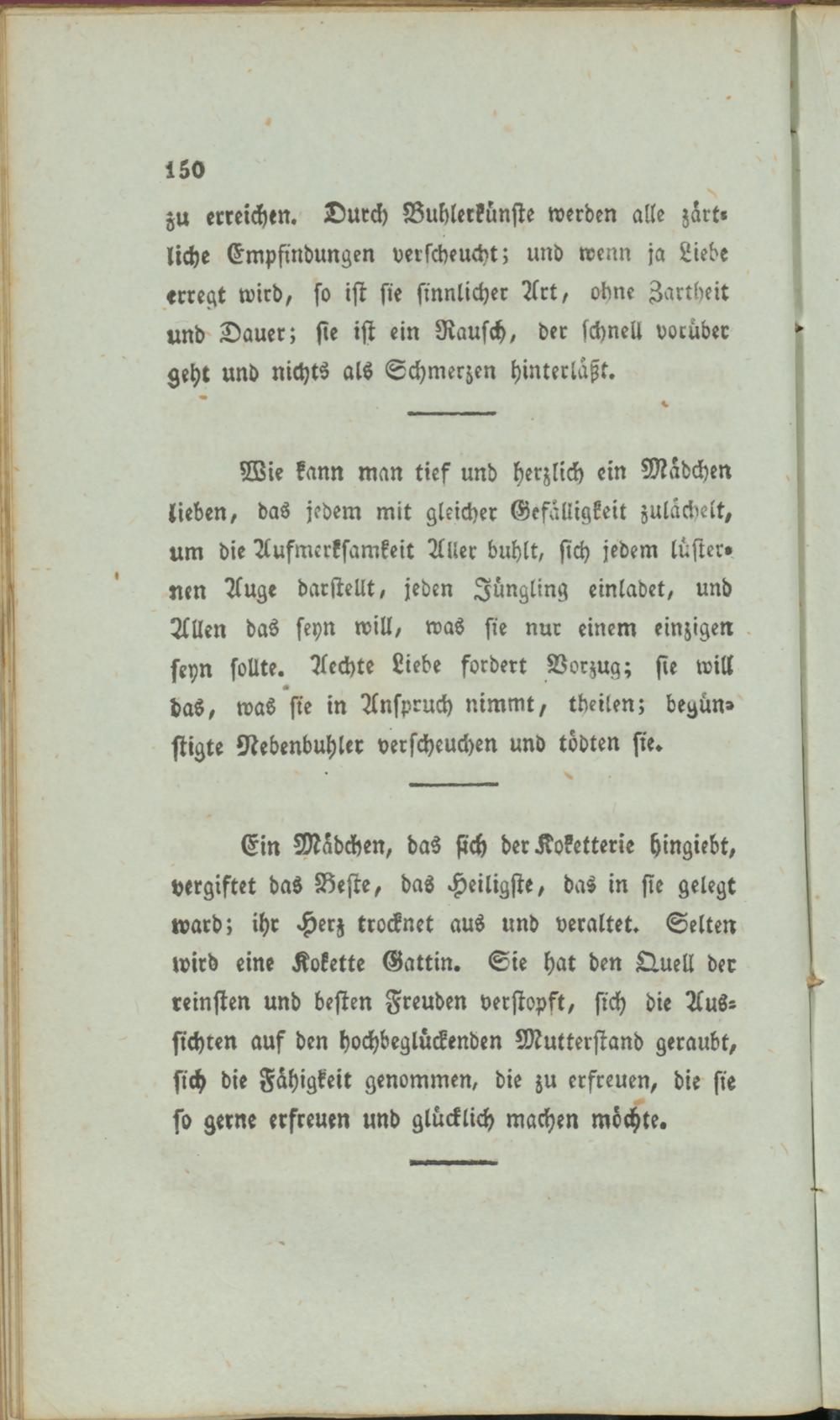 Wie kann man tief und herzlich ein Mädchen lieben, das jedem mit gleicher Gefälligkeit zulächelt, um die Aufmerksamkeit Aller buhlt, sich jedem lüster» nen Auge darstellt, jeden Jüngling einladet, und Allen das seyn will, was sie nur einem einzigen seyn sollte. Aechte Liebe fordert Vorzug; sie will das, was sie in Anspruch nimmt, theilen; begünstigte Nebenbuhler verscheuchen und todten sie.