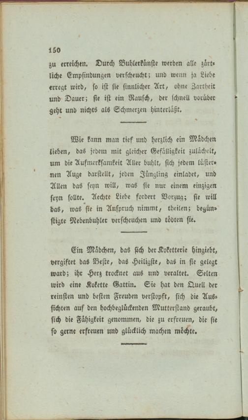 Ein Mädchen, das sich der Koketterie hingiebt, vergiftet das Reste, das Heiligste, das in sie gelegt ward; ihr Herz trocknet aus und veraltet. Selten wird eine Kokette Gattin. Sie hat den Quell der reinsten und besten Freuden verstopft, sich die Aussichten auf den hochbeglückenden Mutterstand geraubt, sich die Fähigkeit genommen, die zu erfreuen, die sie so gerne erfreuen und glücklich machen möchte.