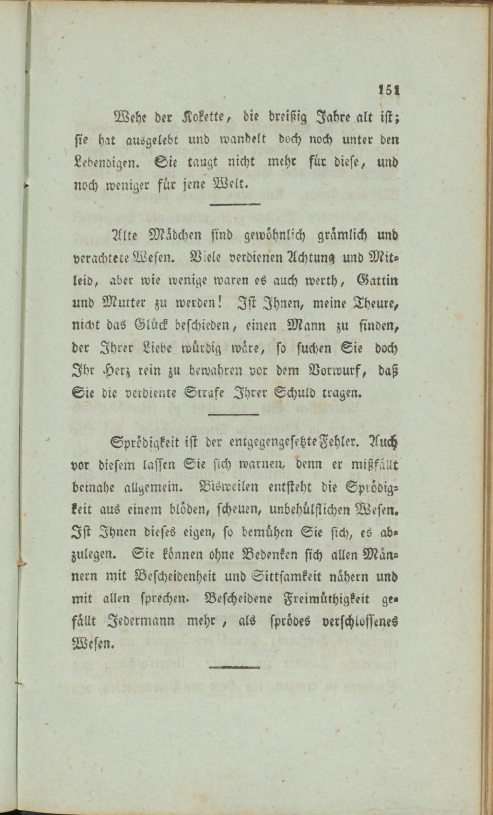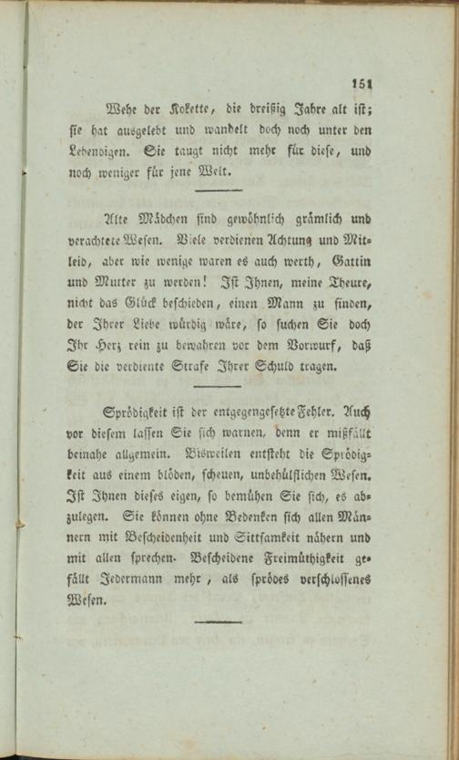 Sprödiqkeit ist der entgegengesetzte Fehler. Auch vor diesem lassen Sie sich warnen, denn er mißfallt bernahe allgemein. Bisweilen entsteht die Sprödig- keit aus einem blöden, scheuen, unbebülflichen Wesen. Ist Ihnen dieses eigen, so bemühen Sie sich, es abzulegen. Sie können ohne Bedenken sich allen Männern mit Bescheidenheit und Sittsamkeit nähern und mit allen sprechen. Bescheidene Freimüthigkeit gefällt Jedermann mehr, als sprödes verschlossenes Wesen.