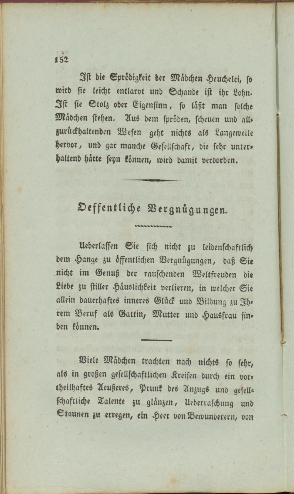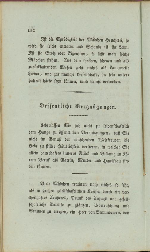 Ueberlassen Sie sich nicht zu leidenschaftlich dem Hange zu öffentlichen Vergnügungen, daß Sie nicht im Genuß der rauschenden Weltfreuden die Liebe zu stiller Häuslichkeit verlieren, in welcher Sie allein dauerhaftes inneres Glück und Bildung zu Ihrem Beruf als Gattin, Mutter und Hausfrau finden können.