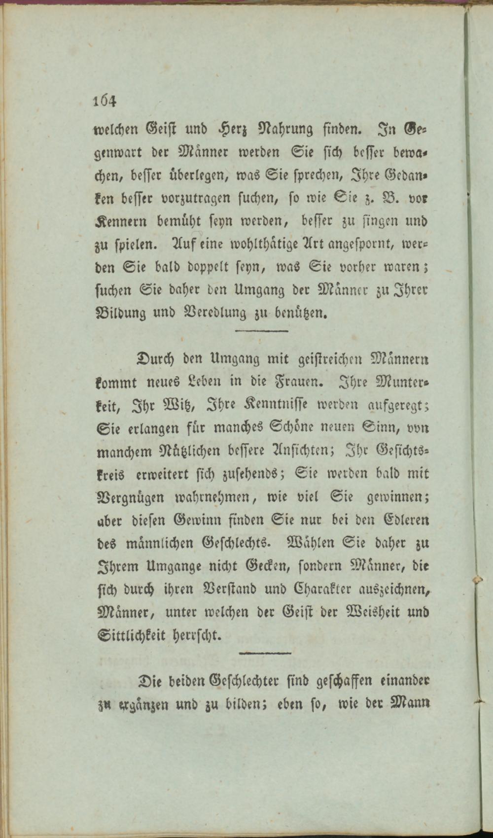 Durch den Umgang mit geistreichen Männern kommt neues Leben in die Frauen. Ihre Munterkeit, Ihr Witz, Ihre Kenntnisse werden aufgeregt; Sie erlangen für manches Schöne neuen Sinn, vvn manchem Nützlichen bessere Ansichten; Ihr Gesichtskreis erweitert sich zusehends; Sie werden bald mit Vergnügen wahrnehmen, wie viel Sie gewinnen; aber diesen Gewinn finden Sie nur bei den Edleren des männlichen Geschlechts. Wählen Sie daher zu Ihrem Umgänge nicht Gecken, sondern Männer, die sich durch ihren Verstand und Charakter auszeichnen, Männer, unter welchen der Geist der Weisheit und Sittlichkeit herrscht.
