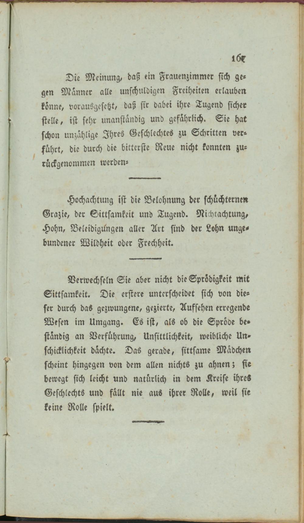 Verwechseln Sie aber nicht die Sprödigkeit Mit Sittsamkeit. Die erstere unterscheidet sich von dieser durch das gezwungene, gezierte, Aufsehen erregende Wesen im Umgang. Es ist, als ob die Spröde beständig an Verführung, Unsittlichkeit, weibliche Unschicklichkeit dachte. Das gerade, sittsame Mädchen scheint hingegen von dem allen nichts zu ahnen; sie bewegt sich leicht und natürlich in dem Kreise ihres Geschlechts und fällt nie aus ihrer Rolle, weil sie keine Rolle spielt.