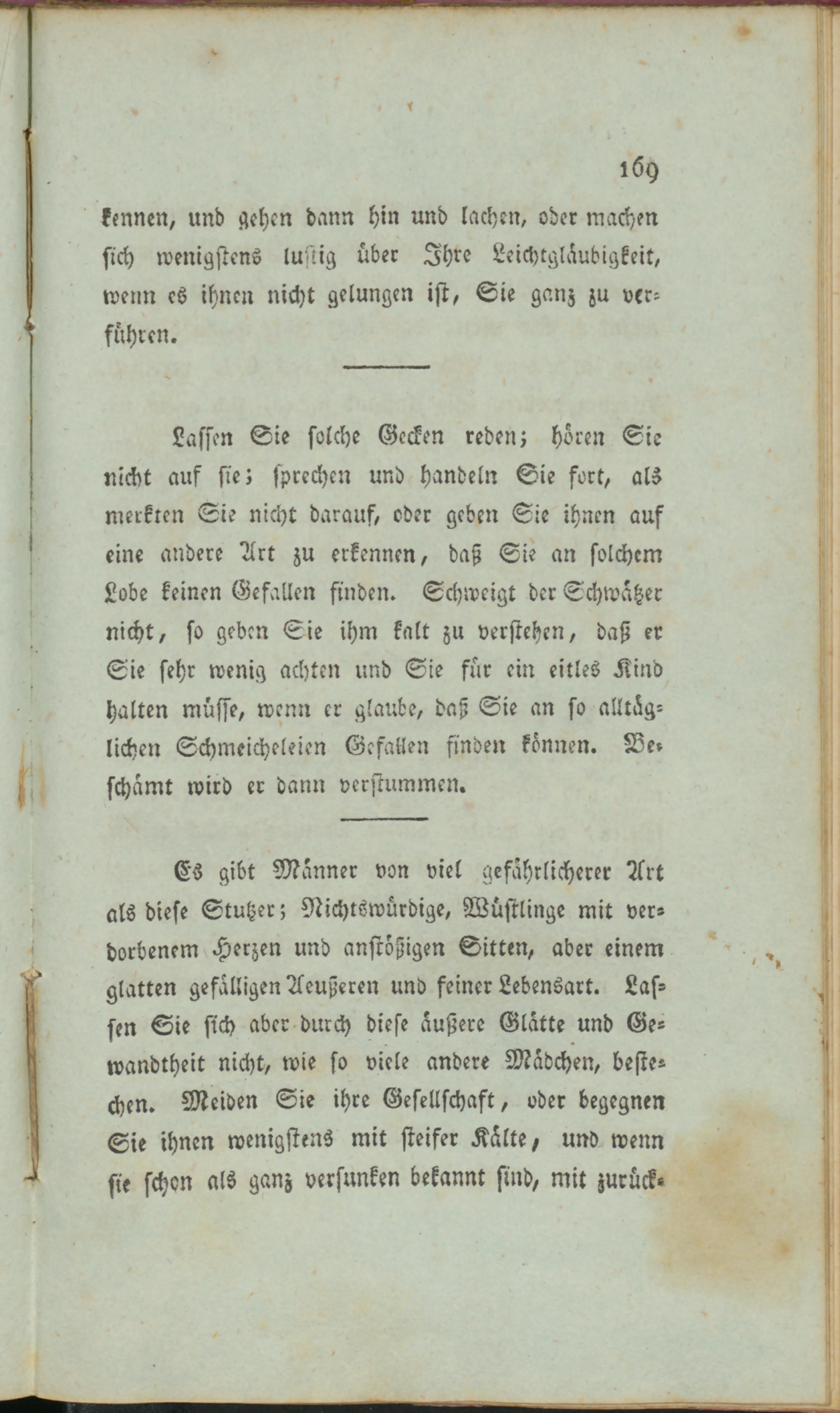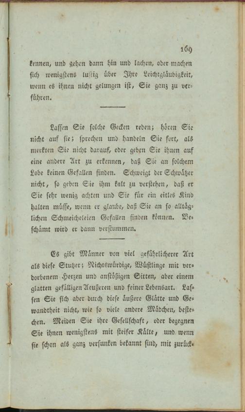 Es gibt Männer von viel gefährlicherer Art als diese Stutzer; Nichtswürdige, Wüstlinge mit verdorbenem Herzen und anstößigen Sitten, aber einem glatten gefälligen Aeußeren und feiner Lebensart. Lassen Sie sich aber durch diese äußere Glätte und Gewandtheit nicht, wie so viele andere Mädchen, bestechen. Meiden Sie ihre Gesellschaft, oder begegnen Sie ihnen wenigstens mit steifer Kälte/ und wenn sie schon als ganz versunken bekannt sind, mit zurück-