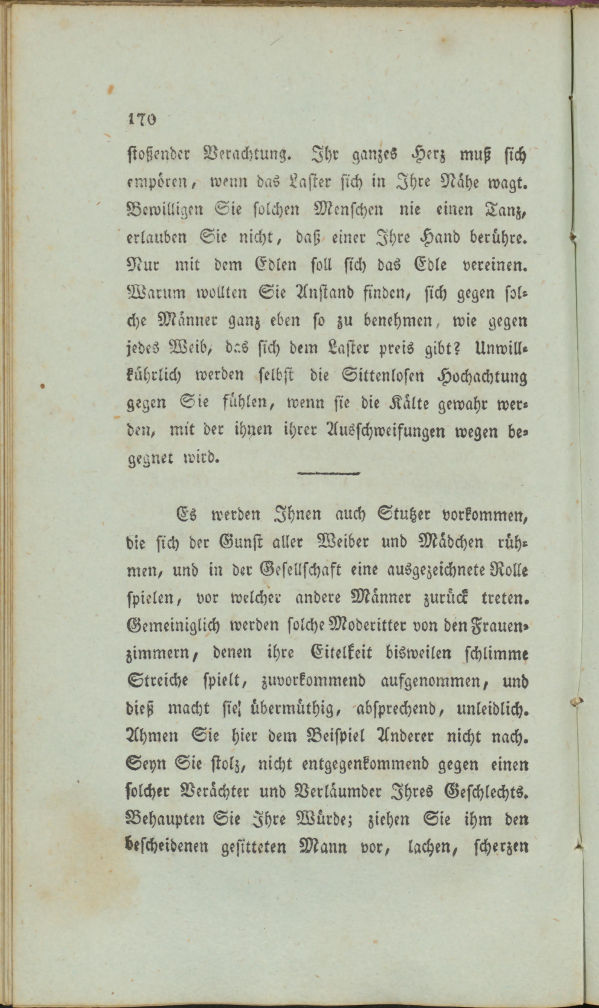 Es werden Ihnen auch Stutzer vorkommen, die sich der Gunst aller Weiber und Mädchen rühmen, und in der Gesellschaft eine ausgezeichnete Rolle spielen, vor welcher andere Männer zurück treten. Gemeiniglich werden solche Moderittec von den Frauenzimmern/ denen ihre Eitelkeit bisweilen schlimme Streiche spielt, zuvorkommend aufgenommen, und dieß macht sie» übermüthig, absprechend, unleidlich. Ahmen Sie hier dem Beispiel Anderer nicht nach. Seyn Sie stolz, nicht entgegenkommend gegen einen solcher Verächter und Verläumder Ihres Geschlechts. Behaupten Sie Ihre Würde; ziehen Sie ihm den bescheidenen gesitteten Mann vor, lachen, scherzen
