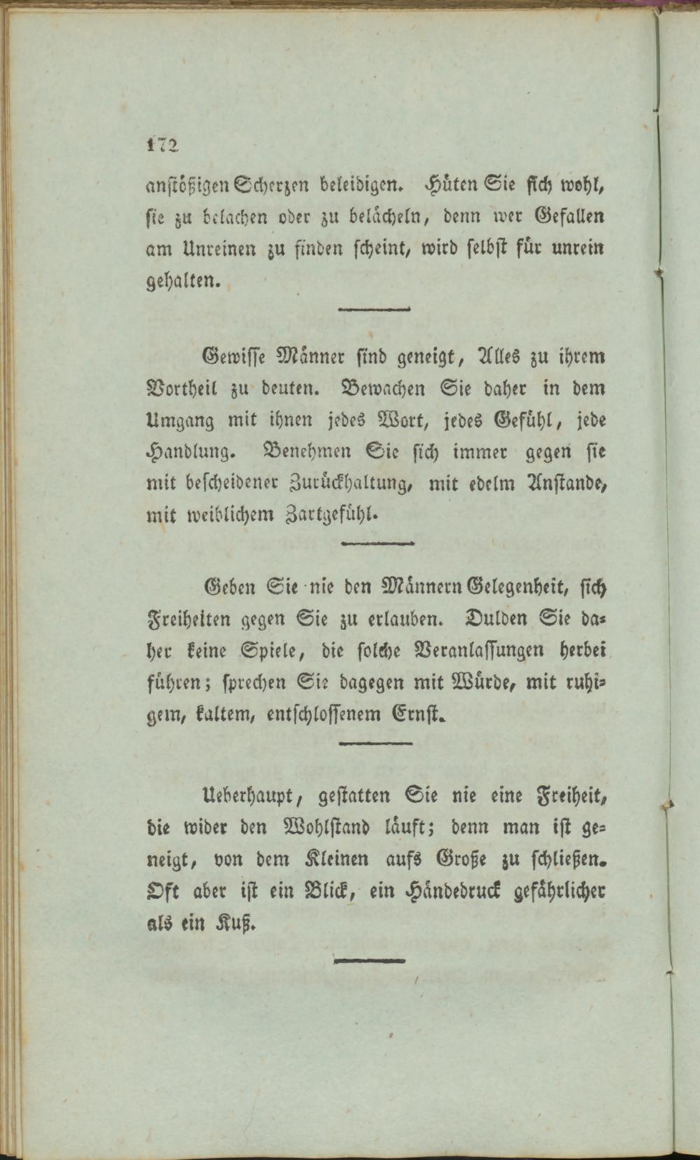 Gewisse Männer sind geneigt, Alles zu ihrem Vortheil zu deuten. Bewachen Sie daher in dem Umgang mit ihnen jedes Wort, jedes Gefühl, jede Handlung. Benehmen Sie sich immer gegen sie mit bescheidener Zurückhaltung, mit edelm Anstande, mit weiblichem Zartgefühl.