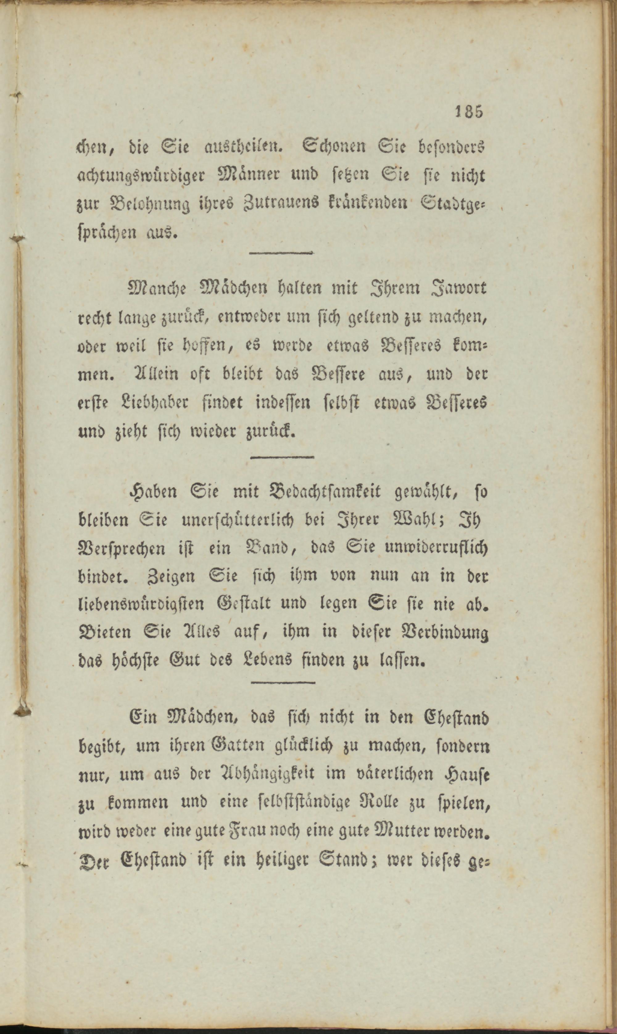 Haben Sie mit Bedachtsamkeit gewählt, so bleiben Sie unerschütterlich bei Ihrer Wahl; Ih Versprechen ist ein Band, das Sie unwiderruflich bindet. Zeigen Sie sich ihm von nun an in der liebenswürdigsten Gestalt und legen Sie sie nie ab. Bieten Sie Alles auf, ihm in dieser Verbindung das höchste Gut des Lebens finden zu lassen.