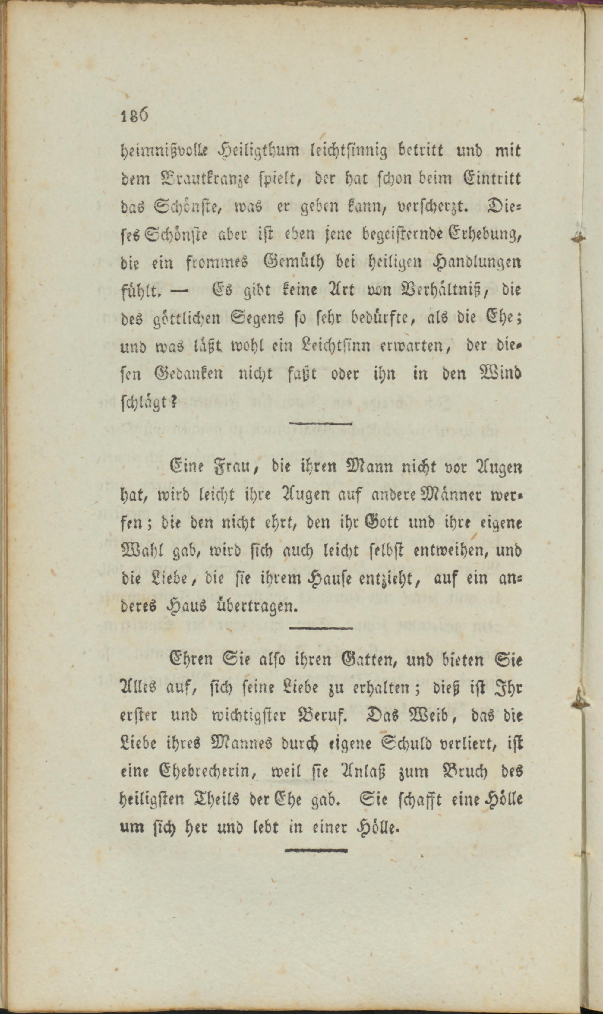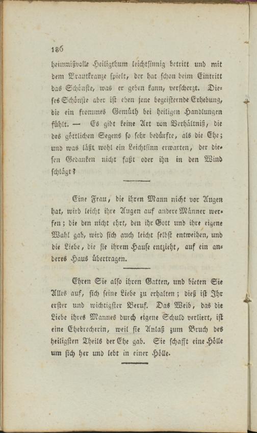 Ehren Sie also ihren Gatten, und bieten Sie Alles auf, sich seine Liebe zu erhalten; dieß ist Ihr erster und wichtigster Beruf. Das Weib, das die Liebe ihres Mannes durch eigene Schuld verliert, ist eine Ehebrecherin, weil sie Anlaß zum Bruch des heiligsten Theils der Ehe gab. Sie schafft eine Hölle um sich her und lebt in einer Hölle.