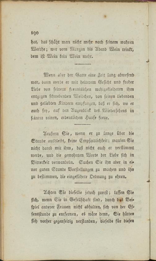Aeußern Sie, wenn er zu lange über die Stunde ausbleibt, keine Empfindlichkeit; maulen Sie nicht darob mit ihm, daß nicht auch er verstimmt werde, und die gewohnten Worte der Liebe sich in Bitterkeit verwandeln. Suchen Sie ihn aber in ei» ner guten Stunde Vorstellungen zu machen und ihn zu bestimmen, die eingeführte Ordnung zu ehren.