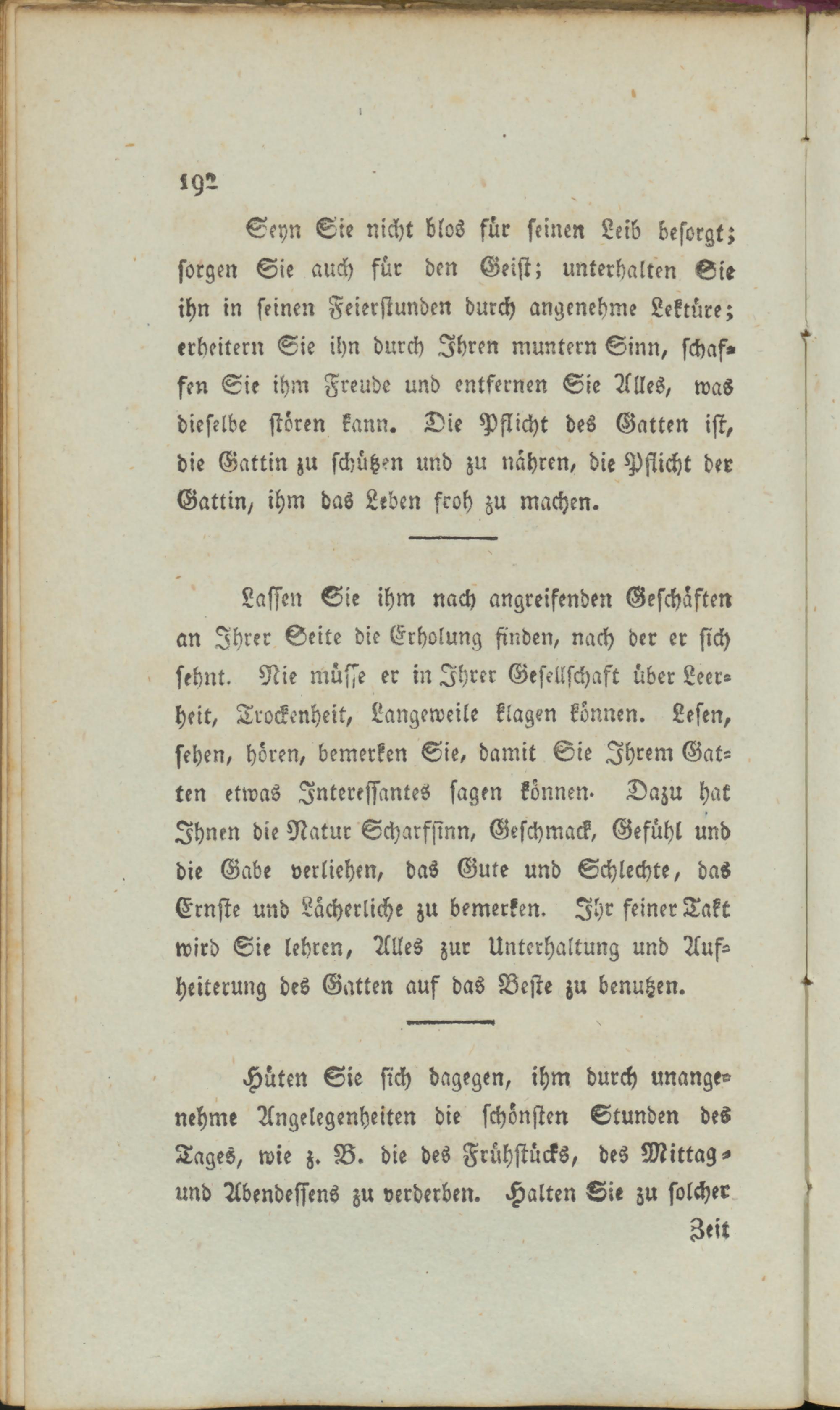Seyn Sie nicht blos für seinen Leib besorgt; sorgen Sie auch für den Geist; unterhalten Sie ihn in seinen Feierstunden durch angenehme Lektüre; erheitern Sie ihn durch Ihren muntern Sinn, schaffen Sie ihm Freude und entfernen Sie Alles, was dieselbe stören kann. Die Pflicht des Gatten ist, die Gattin zu schützen und zu nähren, die Pflicht der Gattin, ihm das Leben froh zu machen.