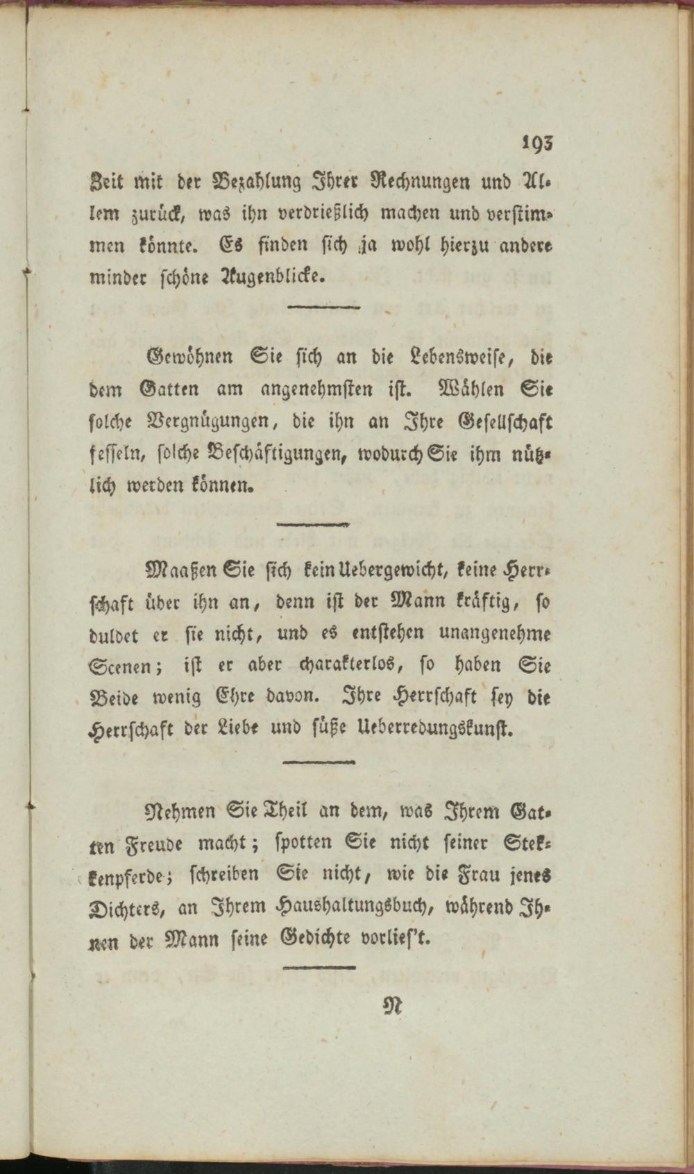 Maaßen Sie sich kein Uebergewicht, keine Herr» schaft über ihn an, denn ist der Mann kräftig, so duldet er sie nicht, und es entstehen unangenehme Scenen; ist er aber charakterlos, so haben Sie Beide wenig Ehre davon. Ihre Herrschaft sey die Herrschaft der Liebe und süße Ueberredungskunst.