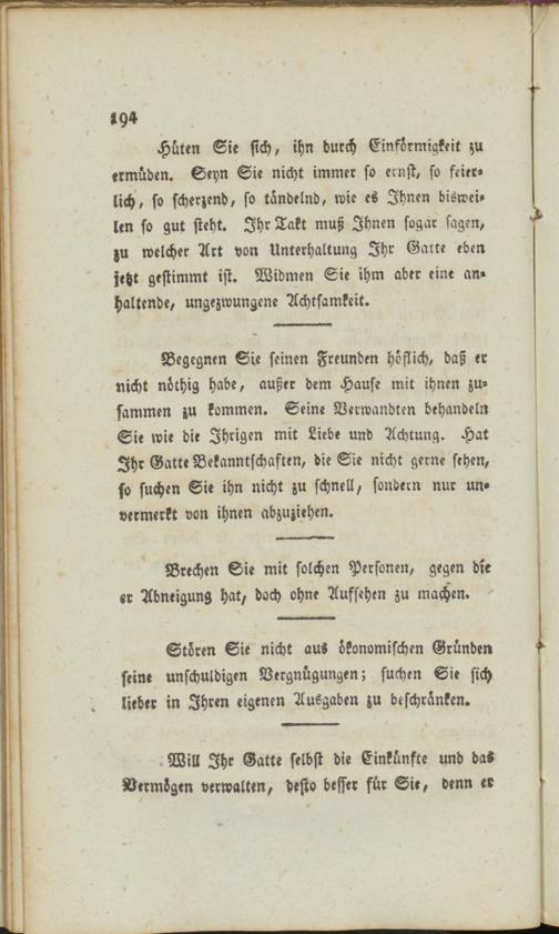 Hüten Sie sich, ihn durch Einförmigkeitzu ermüden. Seyn Sie nicht immer so ernst, so feierlich, so scherzend, so tändelnd, wie es Ihnen bisweilen so gut steht. Ihr Takt muß Ihnen sogar sagen, zu welcher Art von Unterhaltung Ihr Gatte eben jetzt gestimmt ist. Widmen Sie ihm aber eine anhaltende, ungezwungene Achtsamkeit.