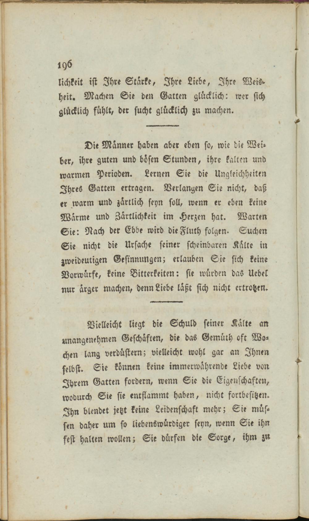 Die Männer haben aber eben so, wie die Wer» ber, ihre guten und bösen Stunden, ihre kalten und warmen Perioden. Lernen Sie die Ungleichheiten Ihres Gatten ertragen. Verlangen Sie nicht, daß er warm und zärtlich seyn soll, wenn er eben keine Warme und Zärtlichkeit im Herzen hat. Warten Sie: Nach der Ebbe wird die Fluch folgen. Suchen Sie nicht die Ursache seiner scheinbaren Kälte in zweideutigen Gesinnungen; erlauben Sie sich keine Vorwürfe, keine Bitterkeiten: sie würden das Uebel nur ärger machen, denn Liebe läßt sich nicht ertrotzen.