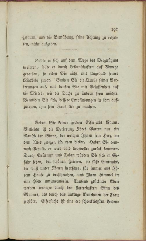 Geben Sie keiner groben Eifersucht Raum. Vielleicht ist die Verirrung Ihres Gatten nur ein Rausch der Sinne, bei welchen Ihnen sein Herz, an dem Alles gelegen ist, treu bleibt. Haben Sie dem« nach Geduld, er wird bald liebevoller zurück kommen. Durch Stürmen und Toben würden Sie sich in Gefahr setzen, den schönen Frieden, die süße Eintracht, die sonst unter Ihnen herrschte, für immer aus Ihrem Hause zu verscheuchen, und Ihren Himmel in eine Hölle umzuwandeln. Tausend glückliche Ehen werden weniger durch den flatterhaften Sinn des Mannes, als durch das unkluge Benehmen der Frau zerstört. Eifersucht ist eine der schrecklichsten Leiden«