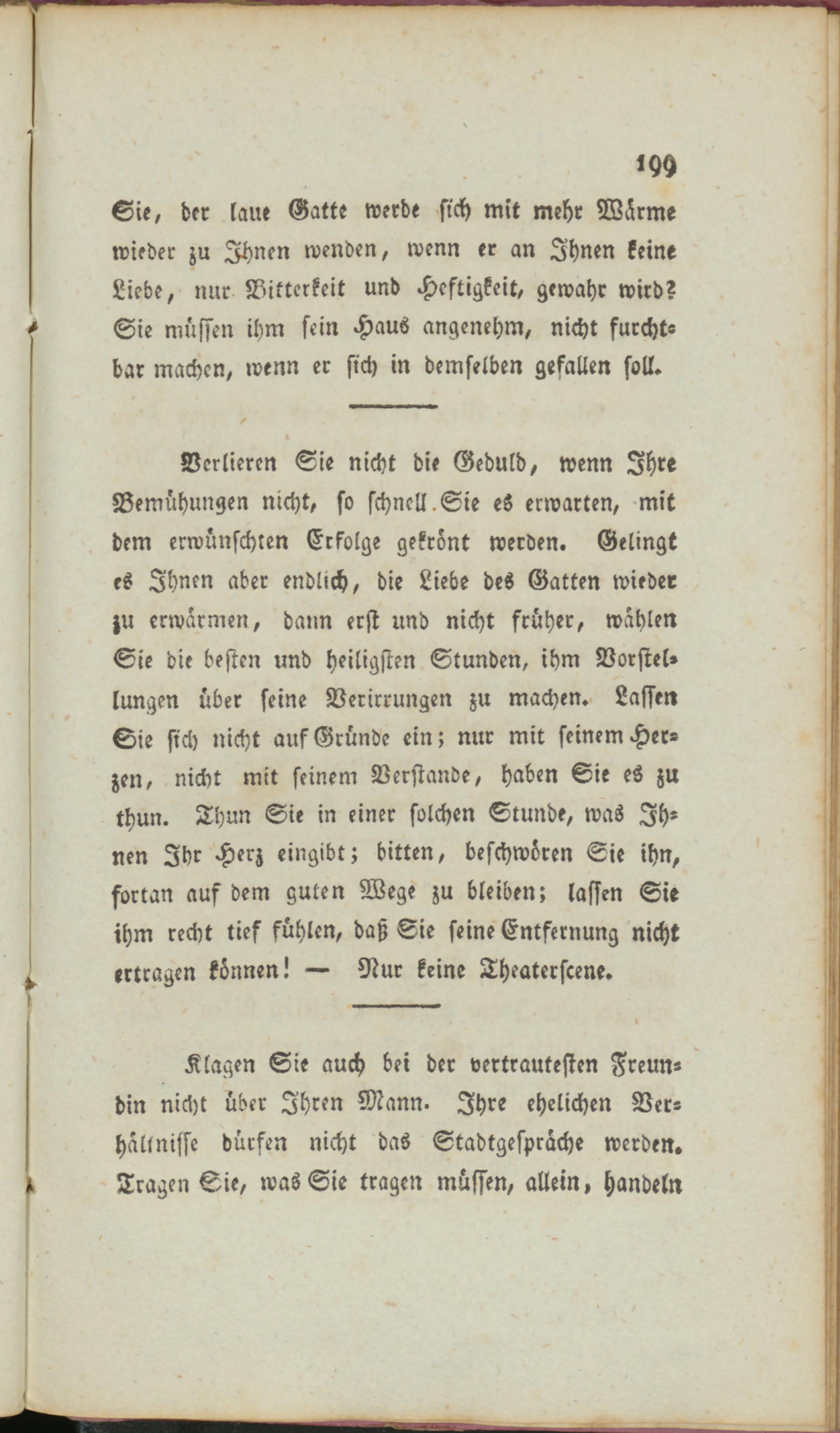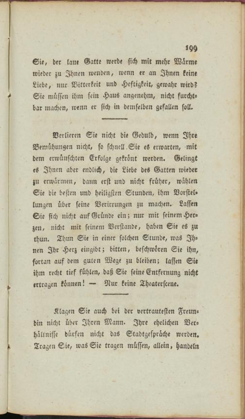Sie, der laue Gatte werde sich mit mehr Wärme wieder zu Ihnen wenden, wenn er an Ihnen keine Liebe, nur Bitterkeit und Heftigkeit, gewahr wird? Sie müssen ihm sein Haus angenehm, nicht furchtbar machen, wenn er sich in demselben gefallen soll.