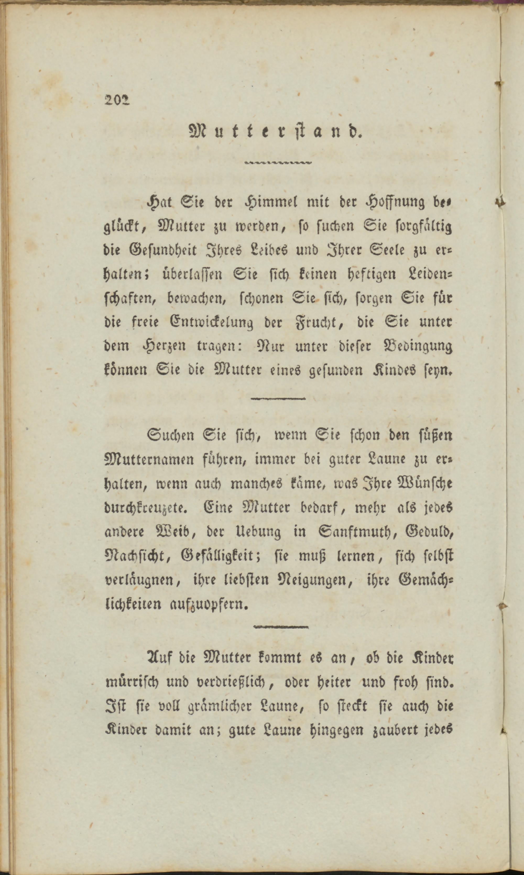 Suchen Sie sich, wenn Sie schon den süßen Mutternamen führen, immer bei guter Laune zu erhalten, wenn auch manches käme, was Ihre Wünsche durchkreuzet?. Eine Mutter bedarf, mehr als jedes andere Weid, der Uebung in Sanftmuth, Geduld, Nachsicht, Gefälligkeit; sie muß lernen, sich selbst verläugnen, ihre liebsten Neigungen, ihre Gemächlichkeiten aufzuopfern.
