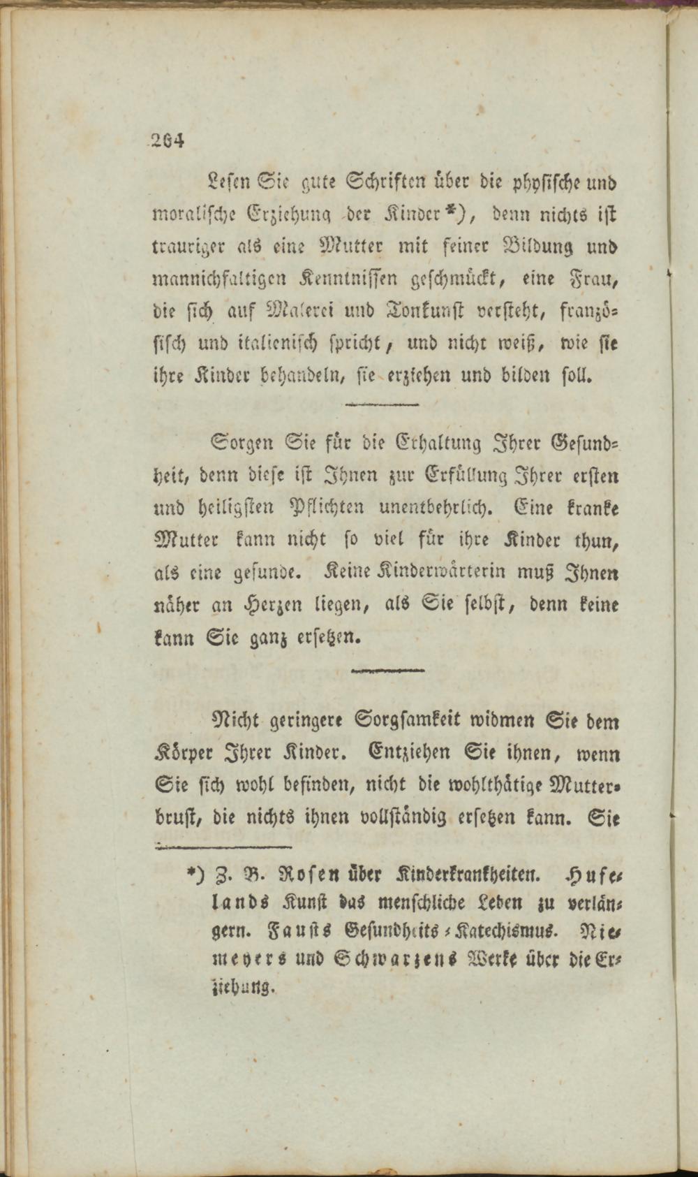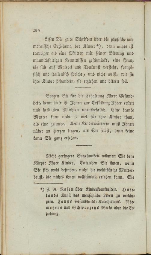Lesen Sie gute Schriften über die physische und moralische Erziehung der Kinder*), denn nichts ist trauriger als eine Mutter mit seiner Bildung und mannichfaltigen Kenntnissen geschmückt, eine Frau, die sich auf Malerei und Tonkunst versteht, französisch und italienisch spricht, und nicht weiß, wie sie ihre Kinder behandeln, sie erziehen und bilden soll.