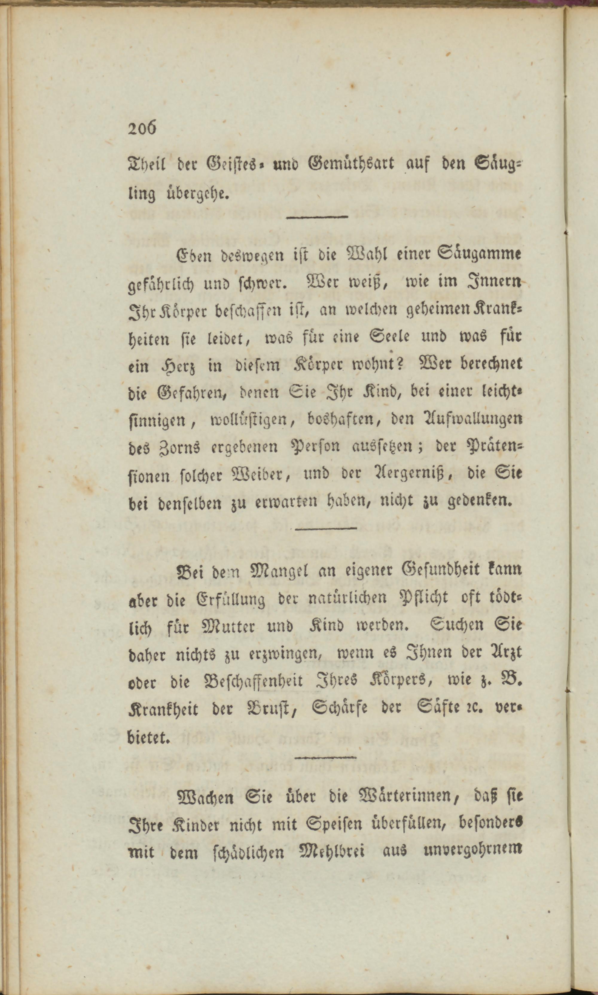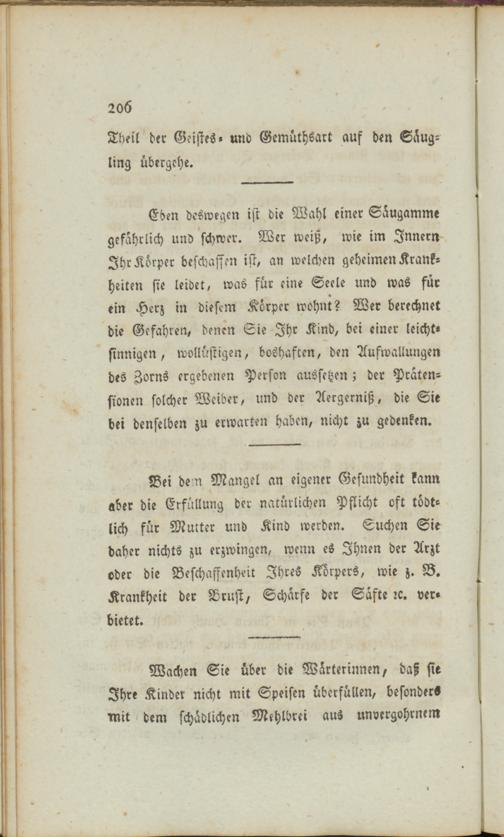 Bei de n Mangel an eigener Gesundheit kann aber die Erfüllung der natürlichen Pflicht oft köstlich für Mutter und Kind werden. Suchen Sie daher nichts zu erzwingen, wenn es Ihnen der Arzt oder die Beschaffenheit Ihres Körpers, wie z. B. Krankheit der Brust, Scharfe der Safte rc. verbietet.
