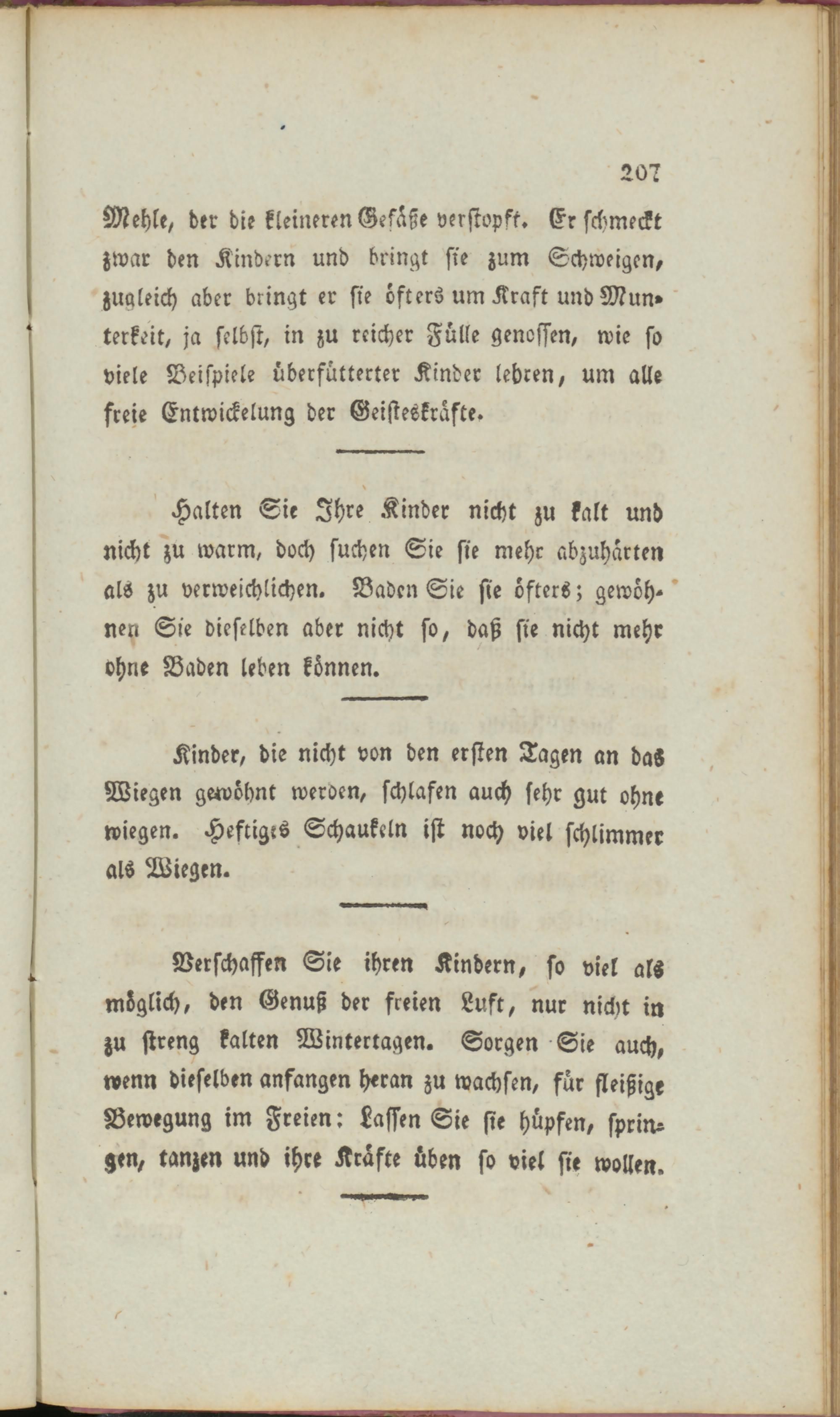 Verschaffen Sie ihren Kindern, so viel als möglich, den Genuß der freien Luft, nur nicht in zu streng kalten Wintertagen. Sorgen Sie auch, wenn dieselben anfangen heran zu wachsen, für fleißige Bewegung im Freien: Lassen Sie sie hüpfen, springen, tanzen und ihre Kräfte üben so viel sie wollen.